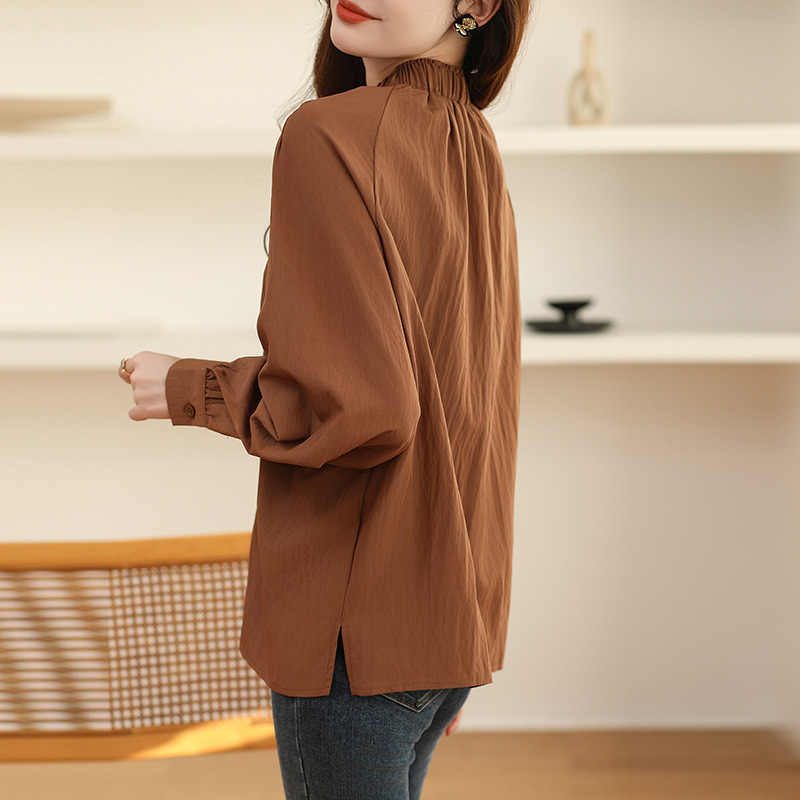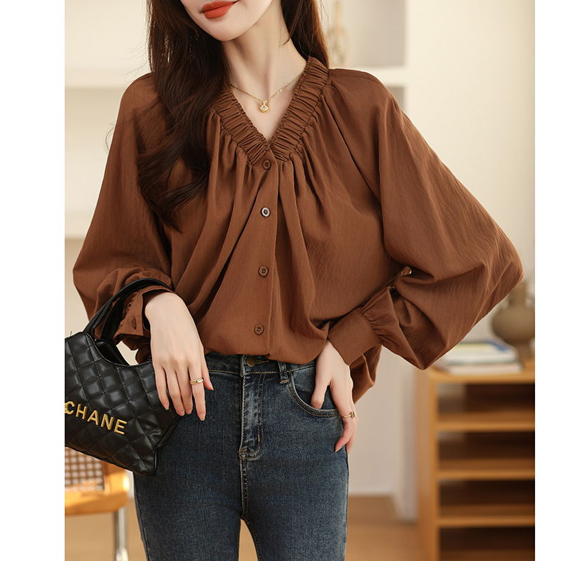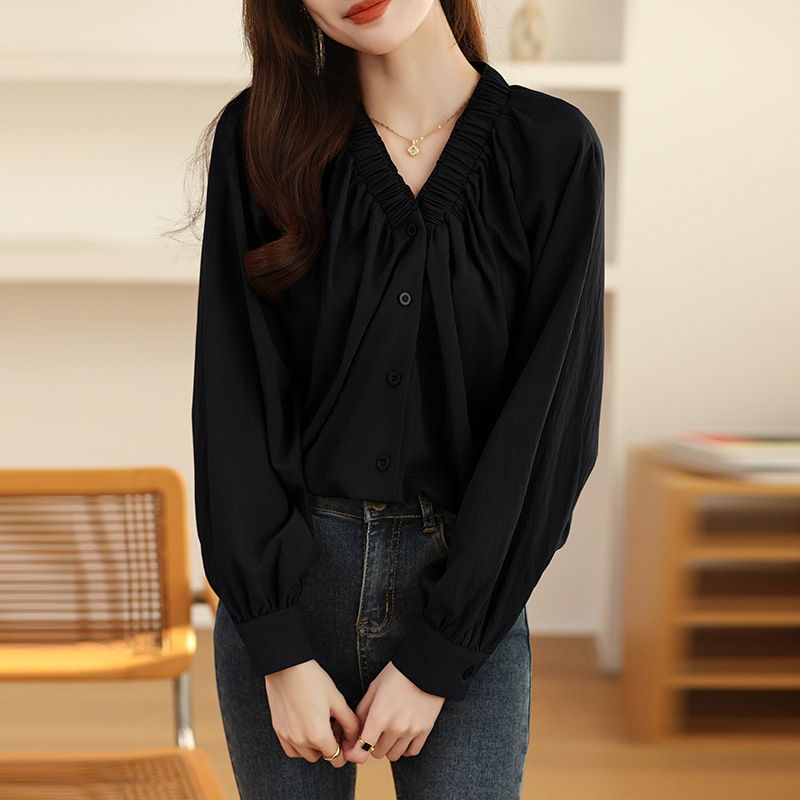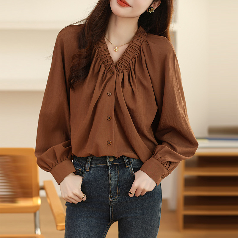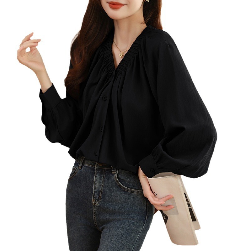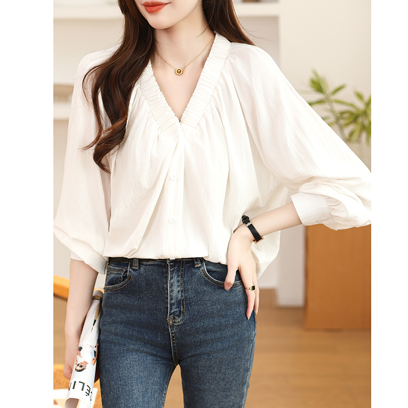 Главная страница > Настоящий выстрел 2024 весна и осень Новая классная ткань в Корейском стиле плиссированный топ во французском стиле с V-образным вырезом свободная рубашка с длинными рукавами для женщин