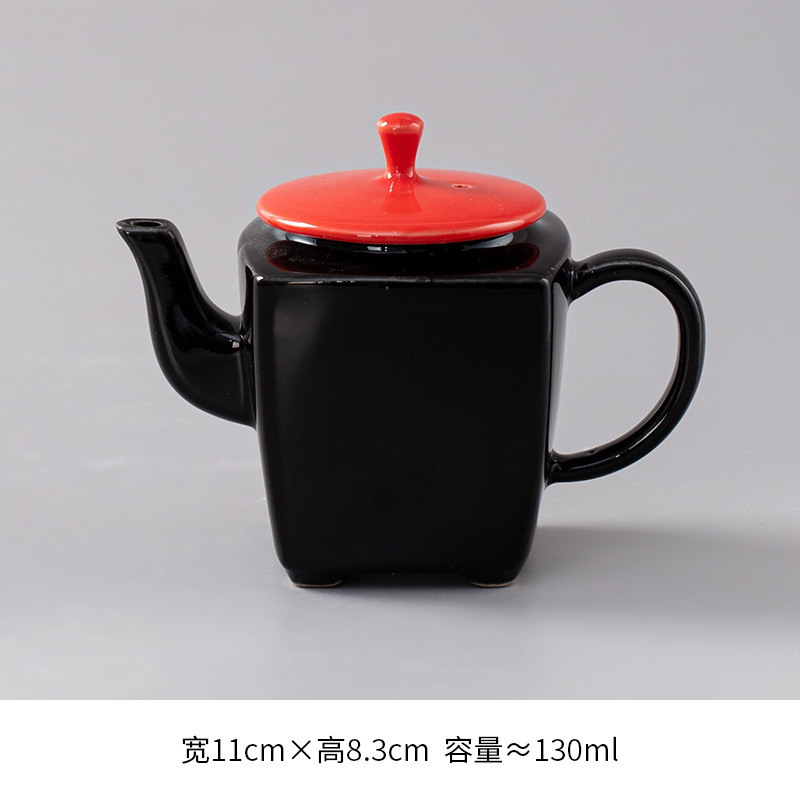 Черный глазурованный квадратный горшок с красной крышкой.