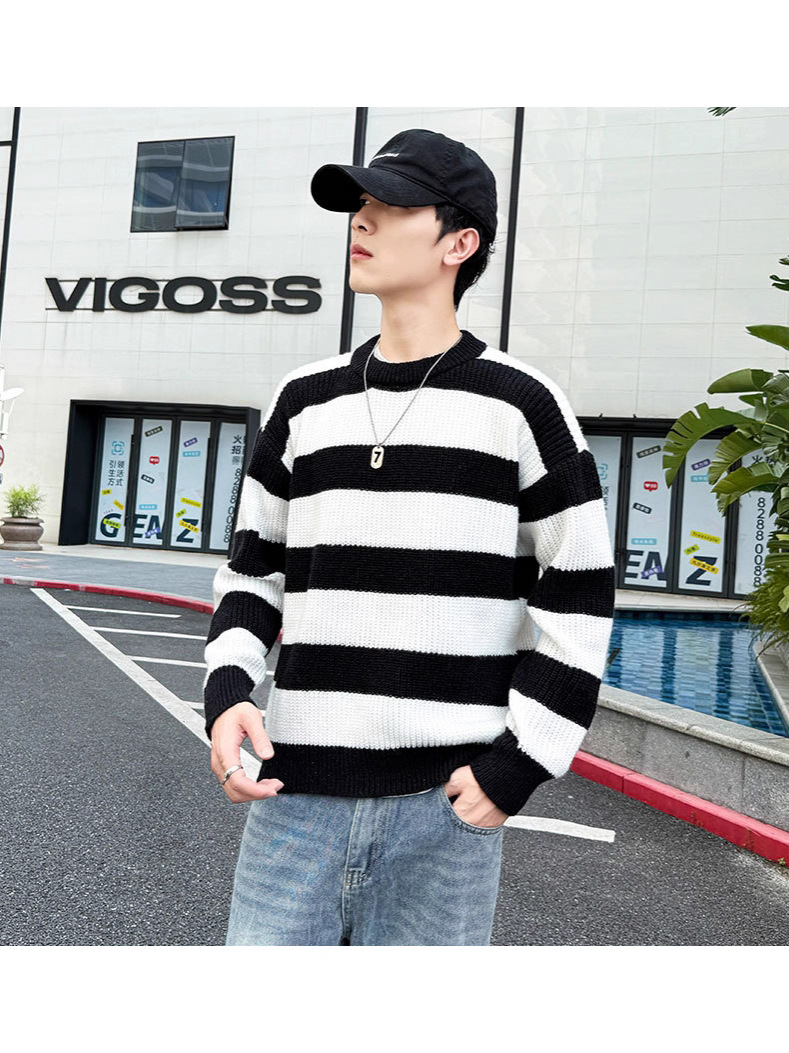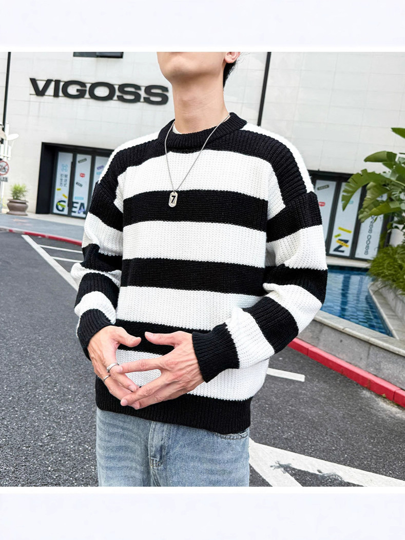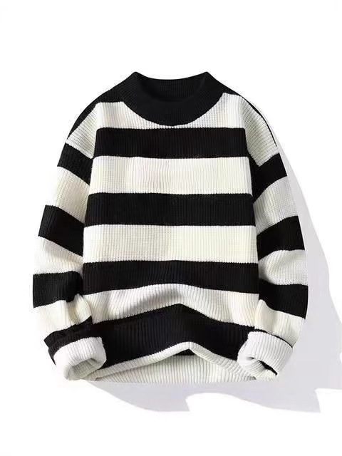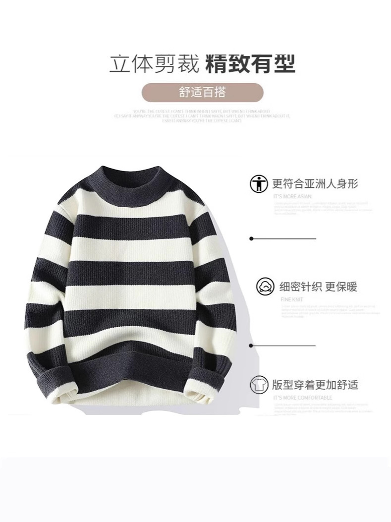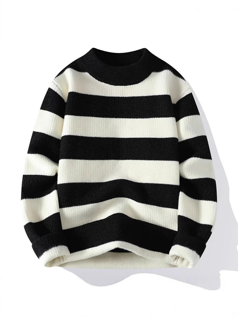 Главная страница > Классический теплый свитер с широкими полосками и воротником-стойкой для мужчин, новинка осени-зимы 2026, свободный базовый трикотажный топ