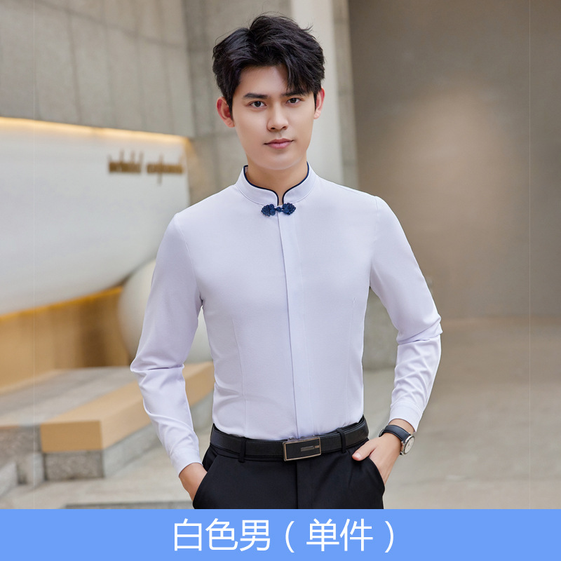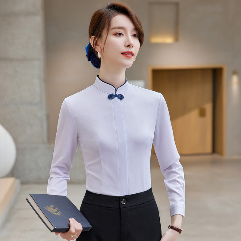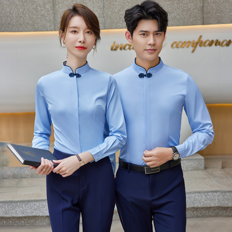 Главная страница > Деловая одежда рубашка с воротником-стойкой в китайском стиле весна и осень отель общественного питания кассир официант рабочая одежда с длинным рукавом Мужчины и женщины в одном стиле