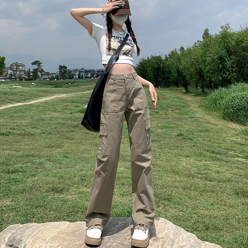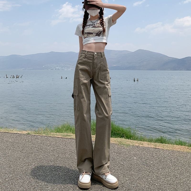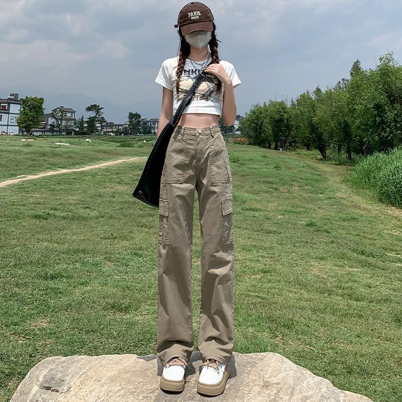 Хаки с высокой талией узкая версия комбинезонов женские летние американские ретро высокие улицы тонкие повседневные широкие джинсы