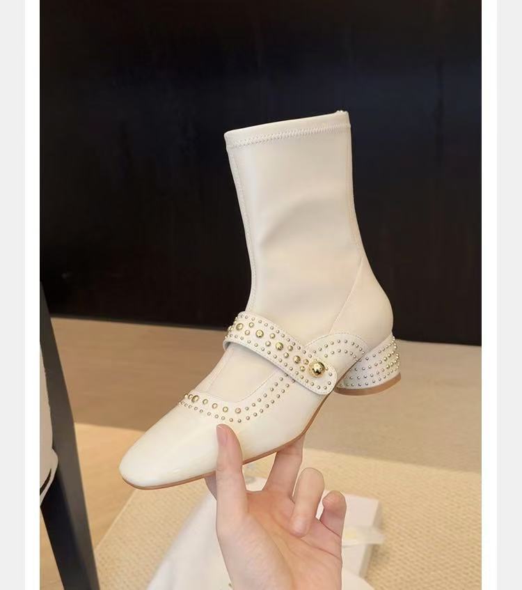 Элегантные эластичные сапоги с молнией сзади, квадратным носком, короткие сапоги с заклепками, сапоги для верховой езды, средней высоты, на массивном каблуке, узкие ботильоны, длинные сапоги для женщин.