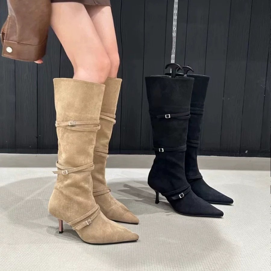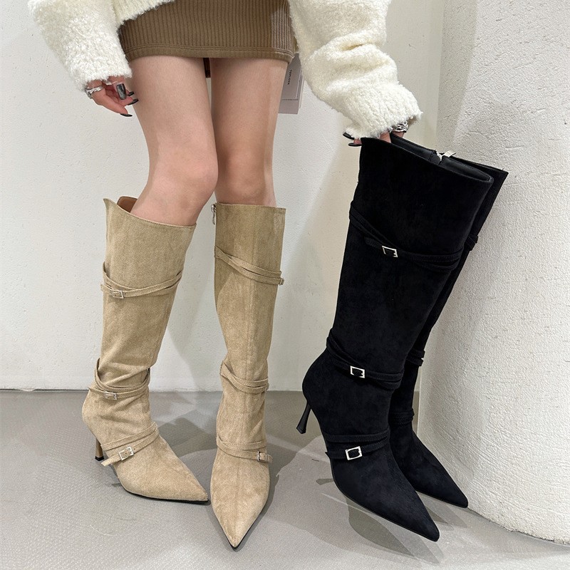 Главная страница > Модные высокие сапоги 2025 года, осенне-зимние, на тонком ремешке, с острым носком, замшевые, на шпильке, высокие сапоги выше колена, женская обувь на высоком каблуке