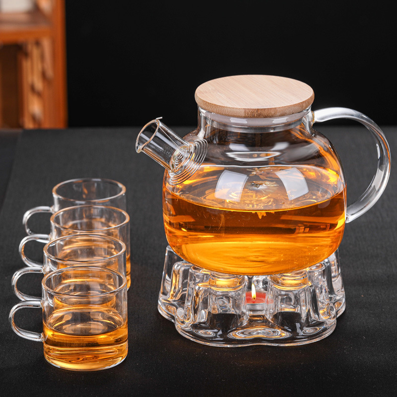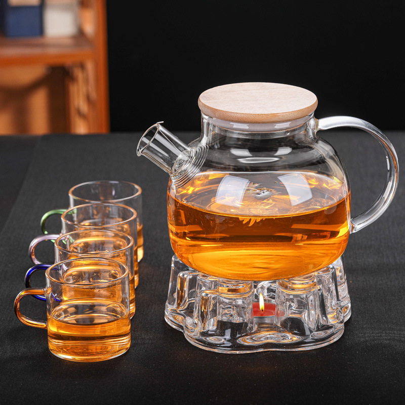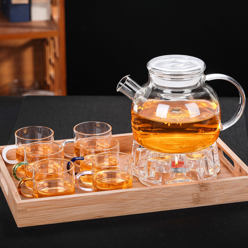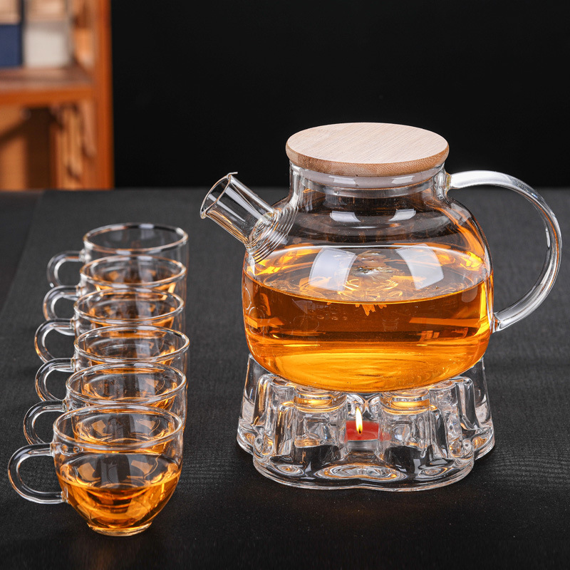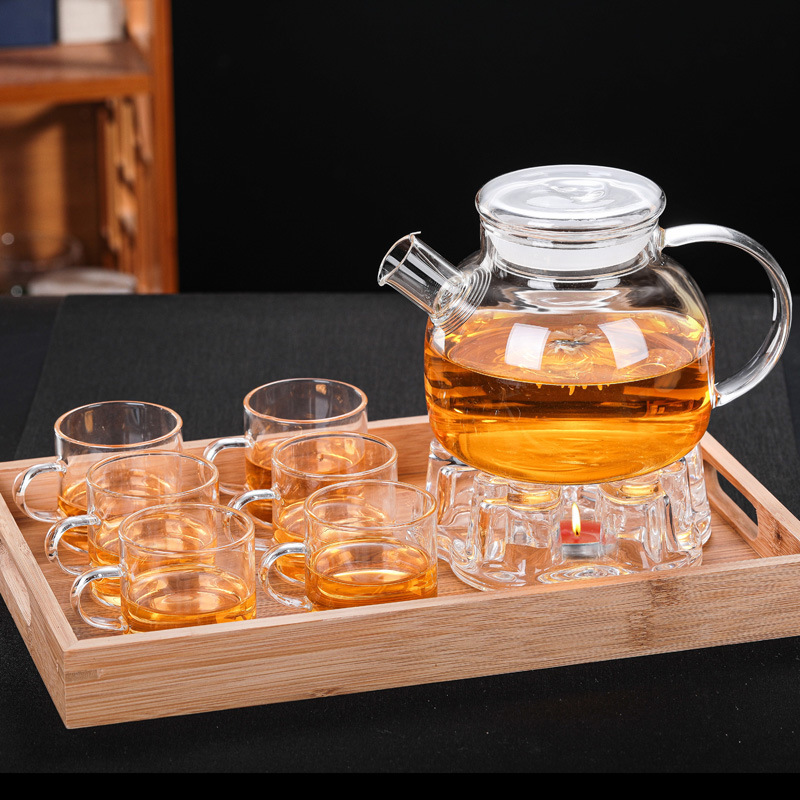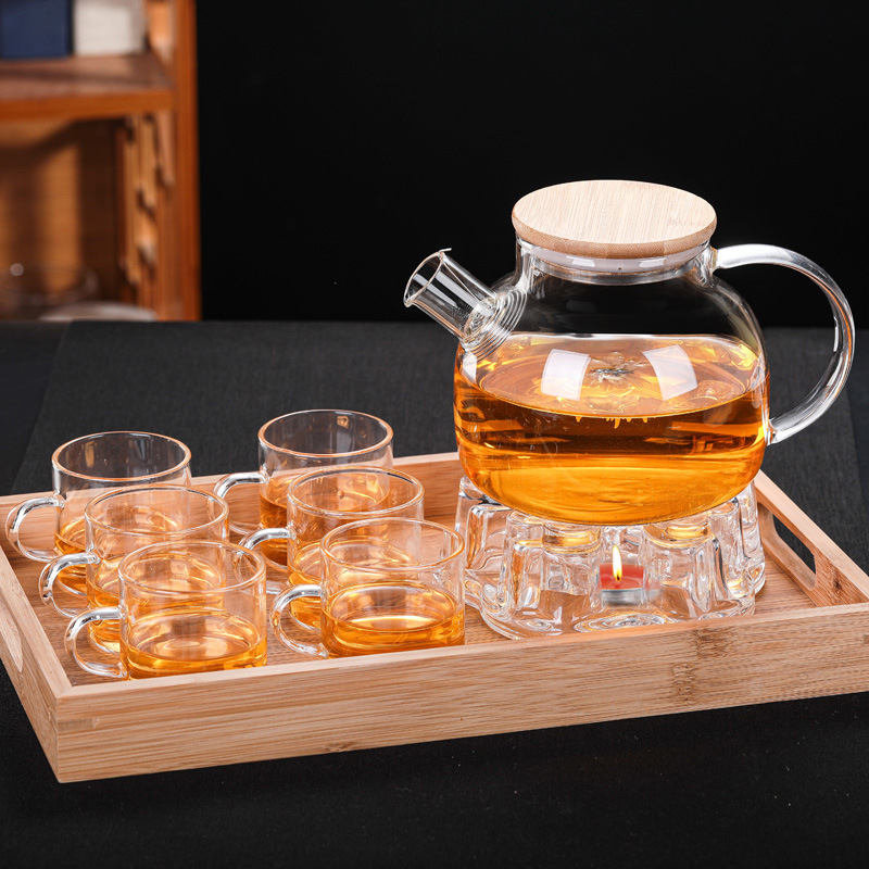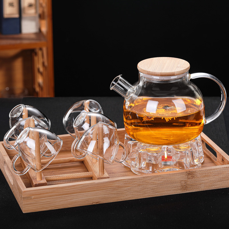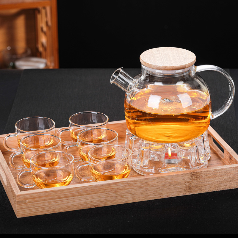 Чайник с бамбуковой крышкой + 6 прозрачных прямых чашек + подставка для чашек + подставка + бамбуковый поднос [10 чайных свечей бесплатно]