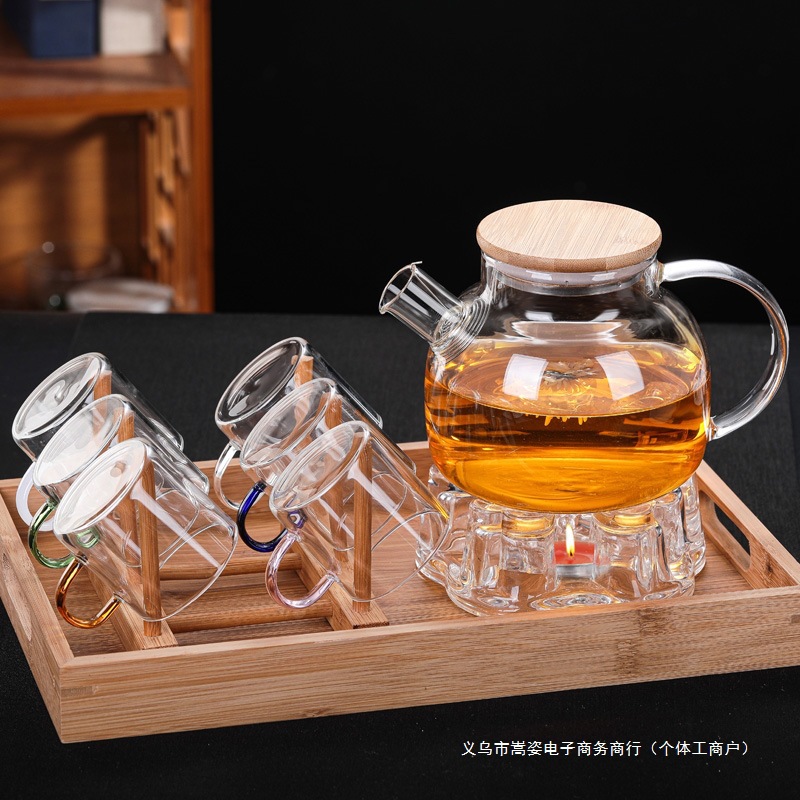 Чайник с стеклянной крышкой + 6 цветных чашек + подставка для чашек + подставка + бамбуковый поднос [в комплекте 10 свечей]?