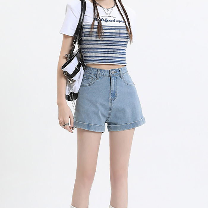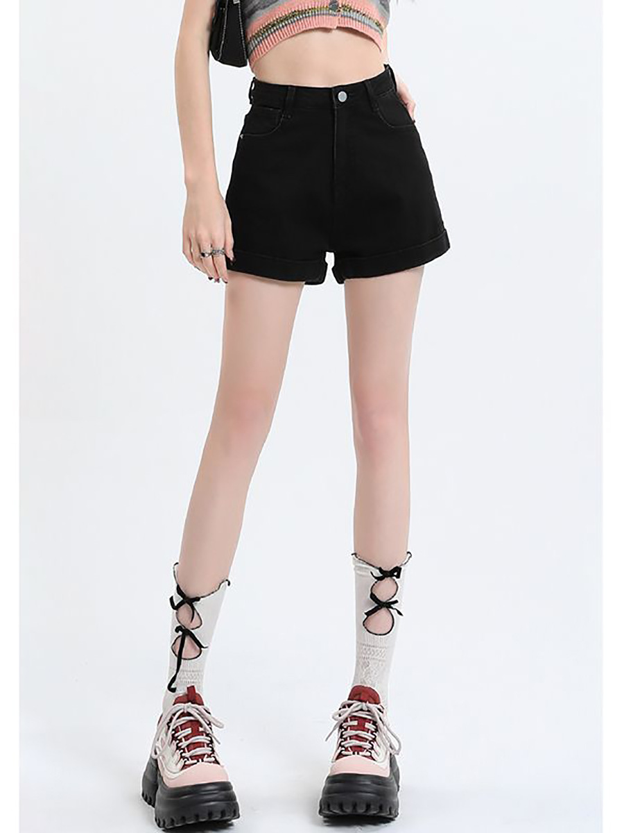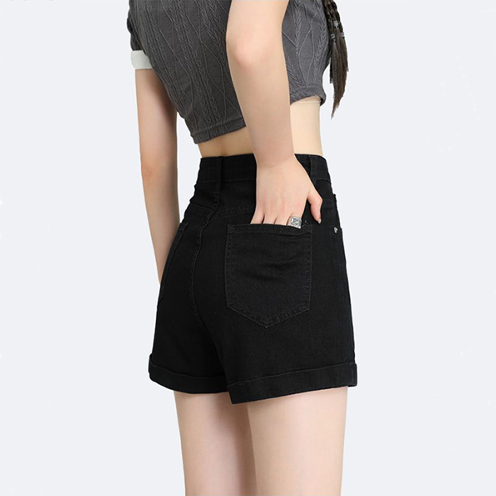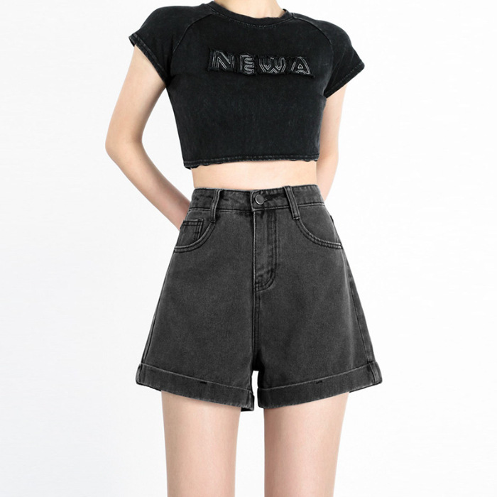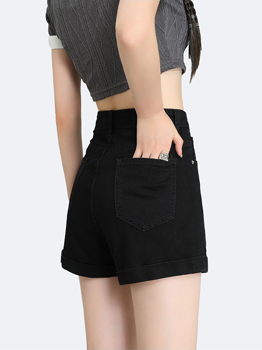 Черные джинсовые шорты для женщин 2026: новинка, с завышенной талией, стройнящие, А-силуэт, для миниатюрных фигур, с подвернутым краем, летние, тонкие, модные.