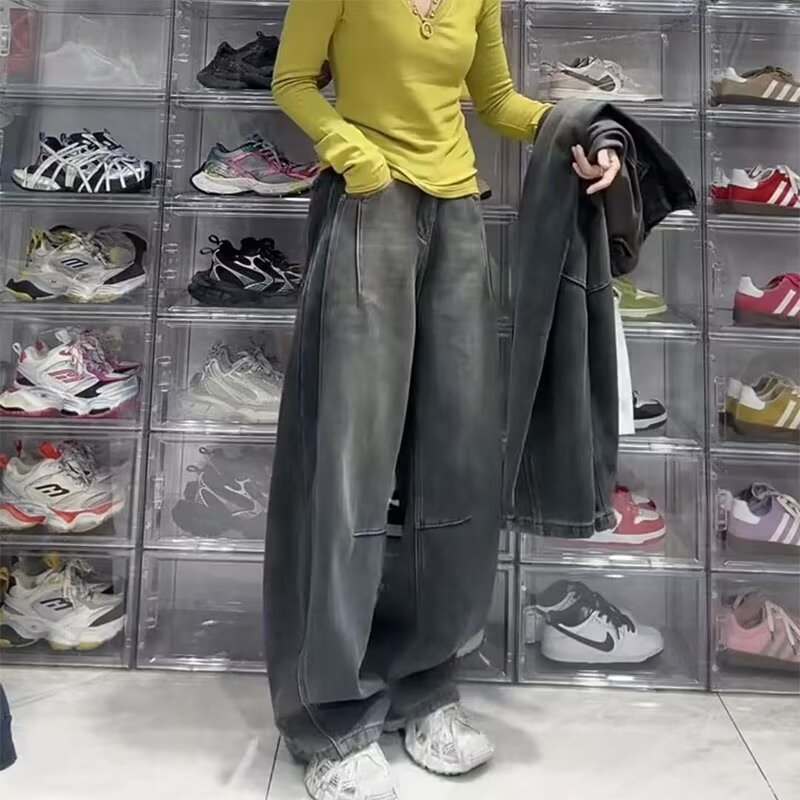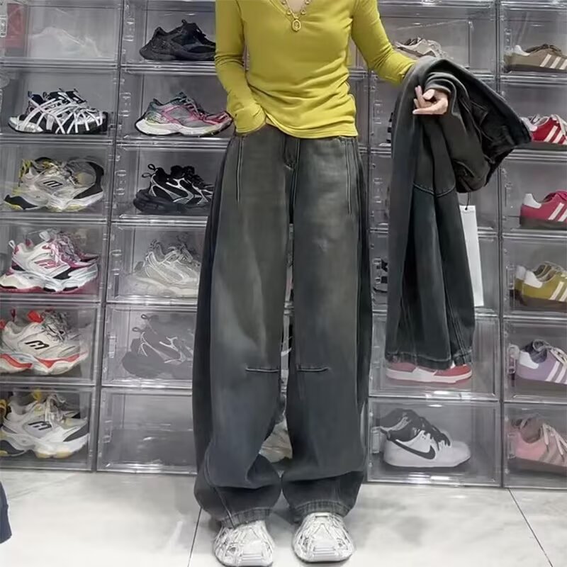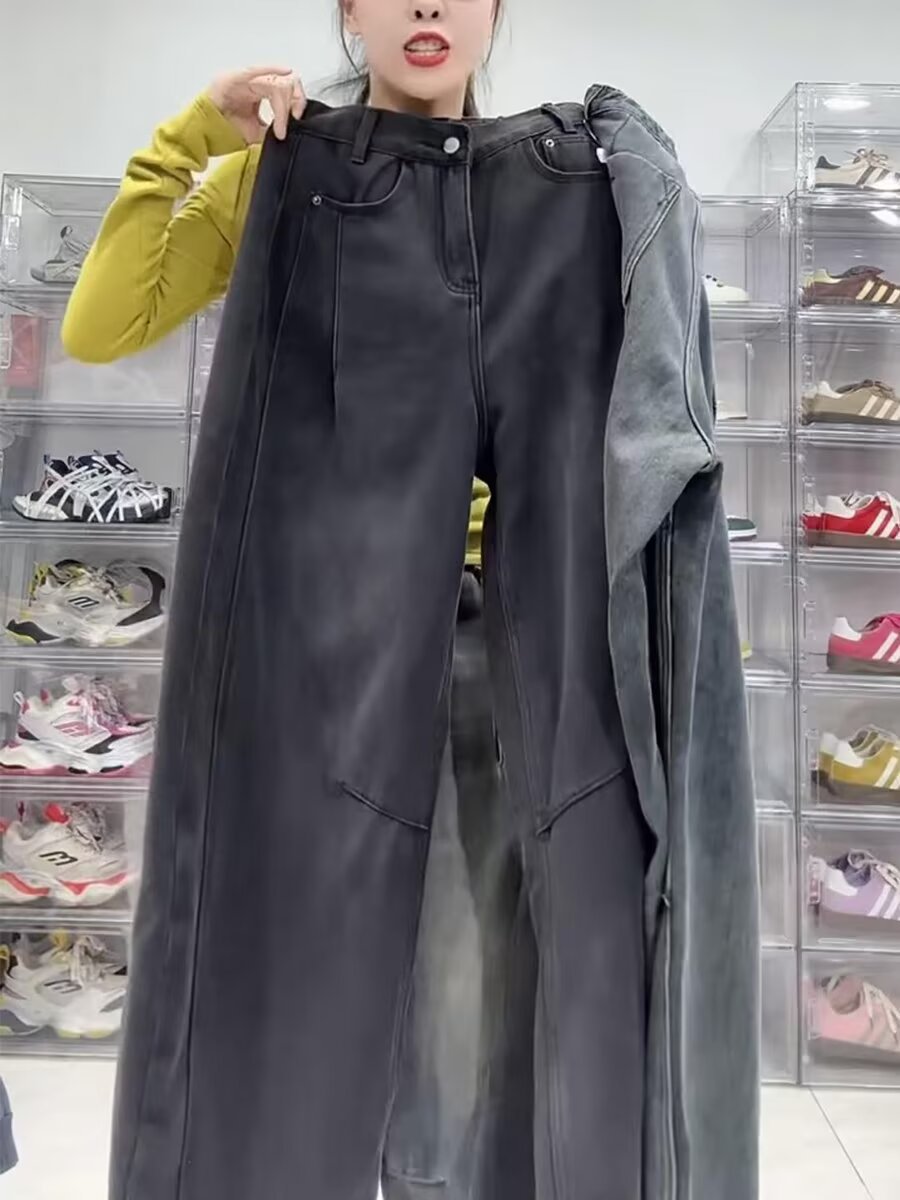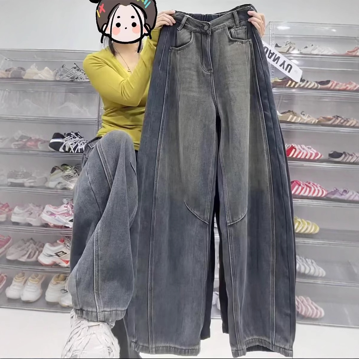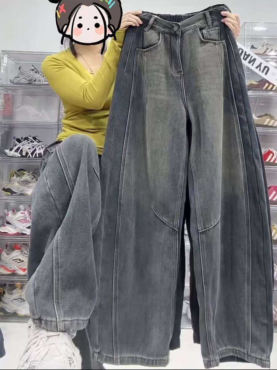 Главная страница > Весенние прямые джинсы больших размеров в стиле ретро для женщин, подходящие для фигуры грушевидной формы, свободные утягивающие широкие брюки-сабо с высокой талией.