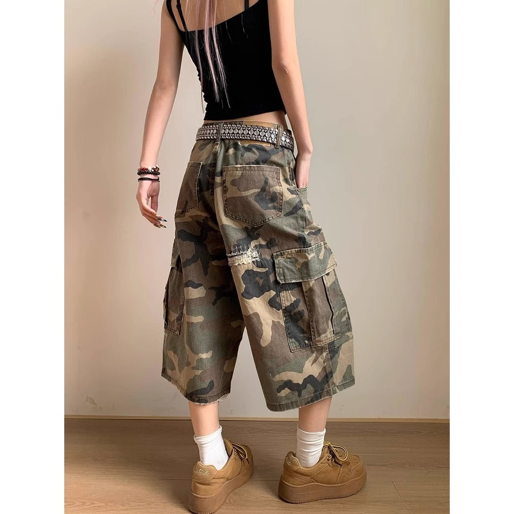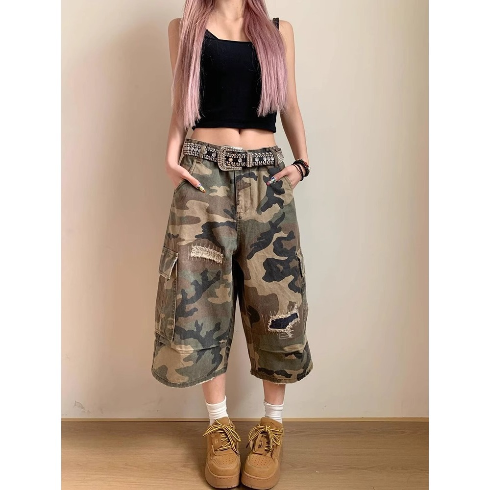 Американский ретро-дырки большого размера с прямым камуфляжным камуфляжным семиочковым джинсами женский дизайн рыхлый, тонкие широкие брюки