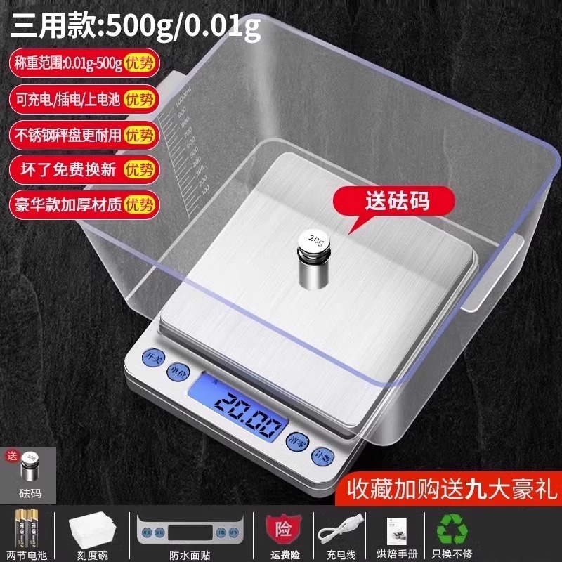 [Точность 0,01 г] Трехцелевая модель, вес + чаша весов + двойной лоток + кабель для зарядки + аккумулятор + водонепроницаемая наклейка
