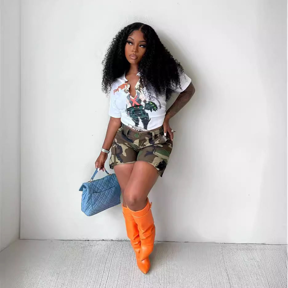 2107 трансграничные европейские и американские амазонка 2023 летние женские камуфляжные наклейки с принтом сумка шитье шорты