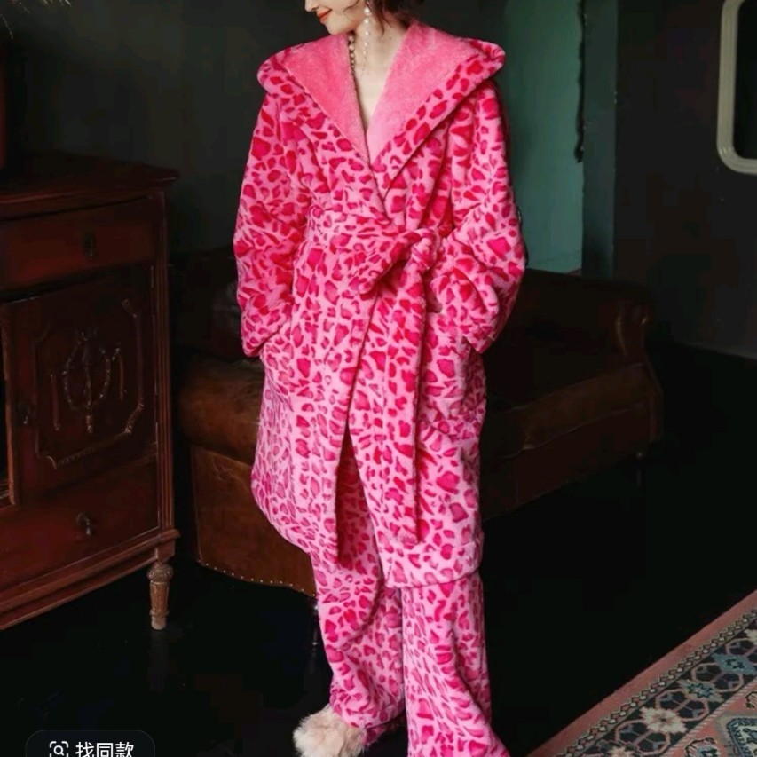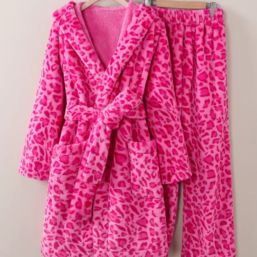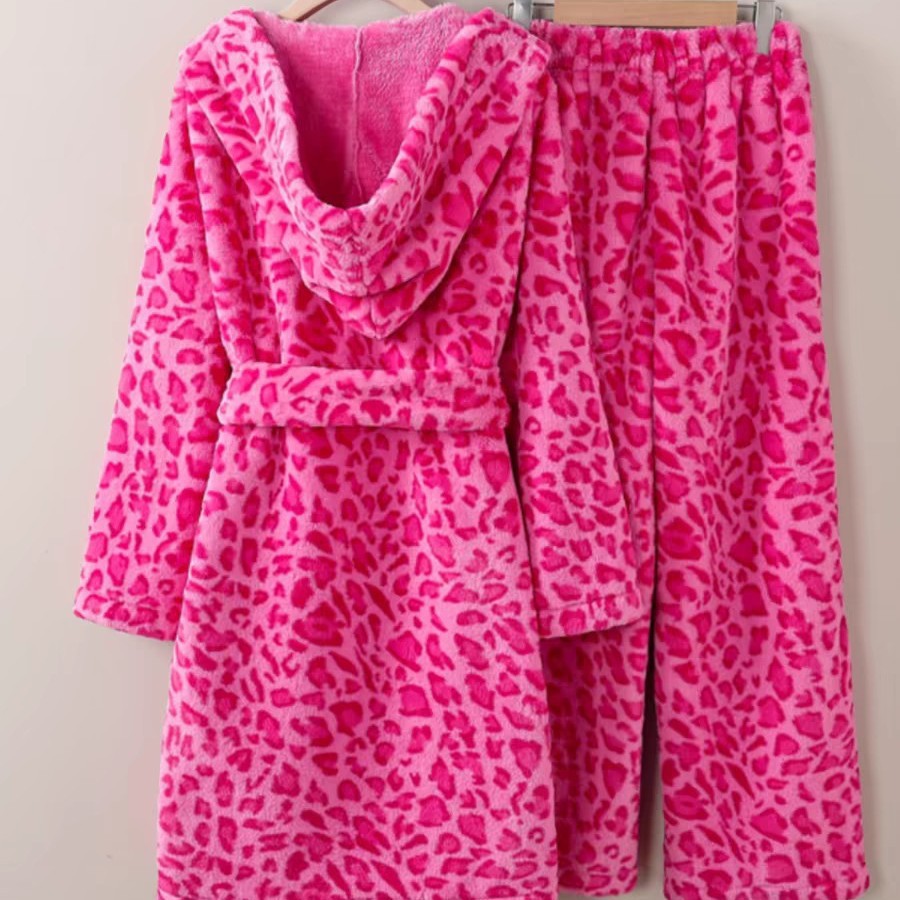 Главная страница > Розовая пижама с леопардовым принтом для женщин на осень и зиму, утепленная, с капюшоном из кроличьего меха, создающая ощущение роскоши, может носиться и вне дома, комплект для дома