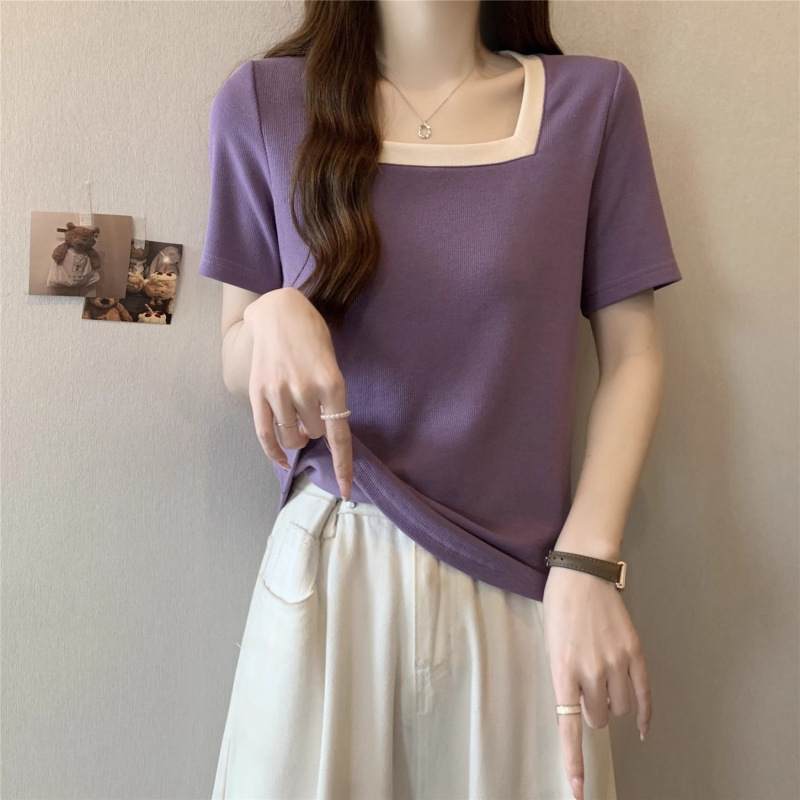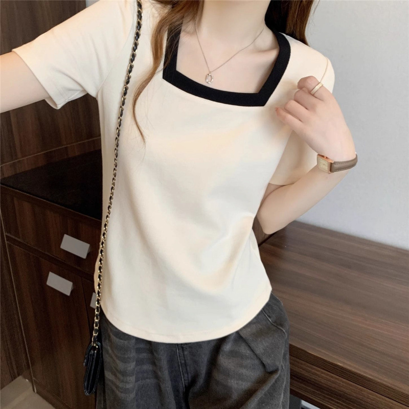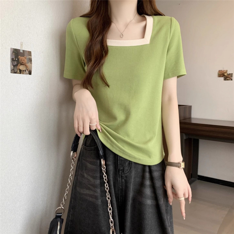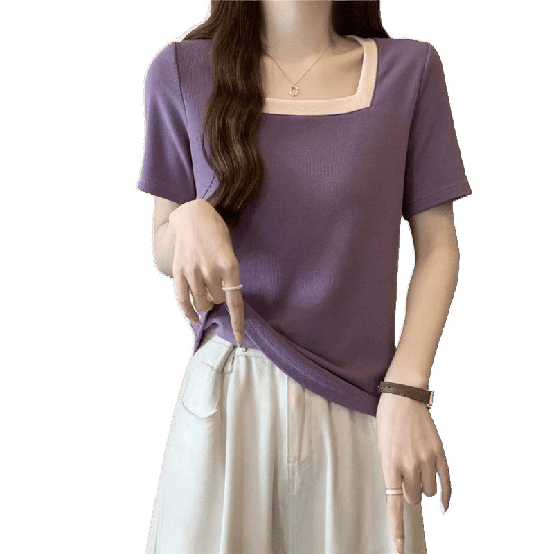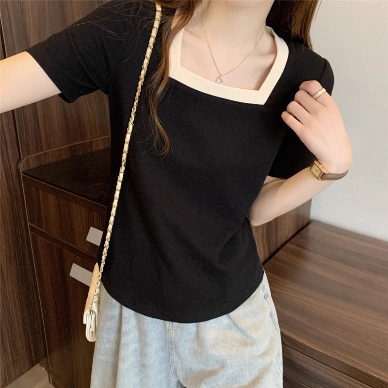 Главная страница > 2025 женская футболка с короткими рукавами и квадратным воротником контрастного цвета на правое плечо, женская тонкая и универсальная свободная футболка, закрывающая живот, простая и освежающая футболка