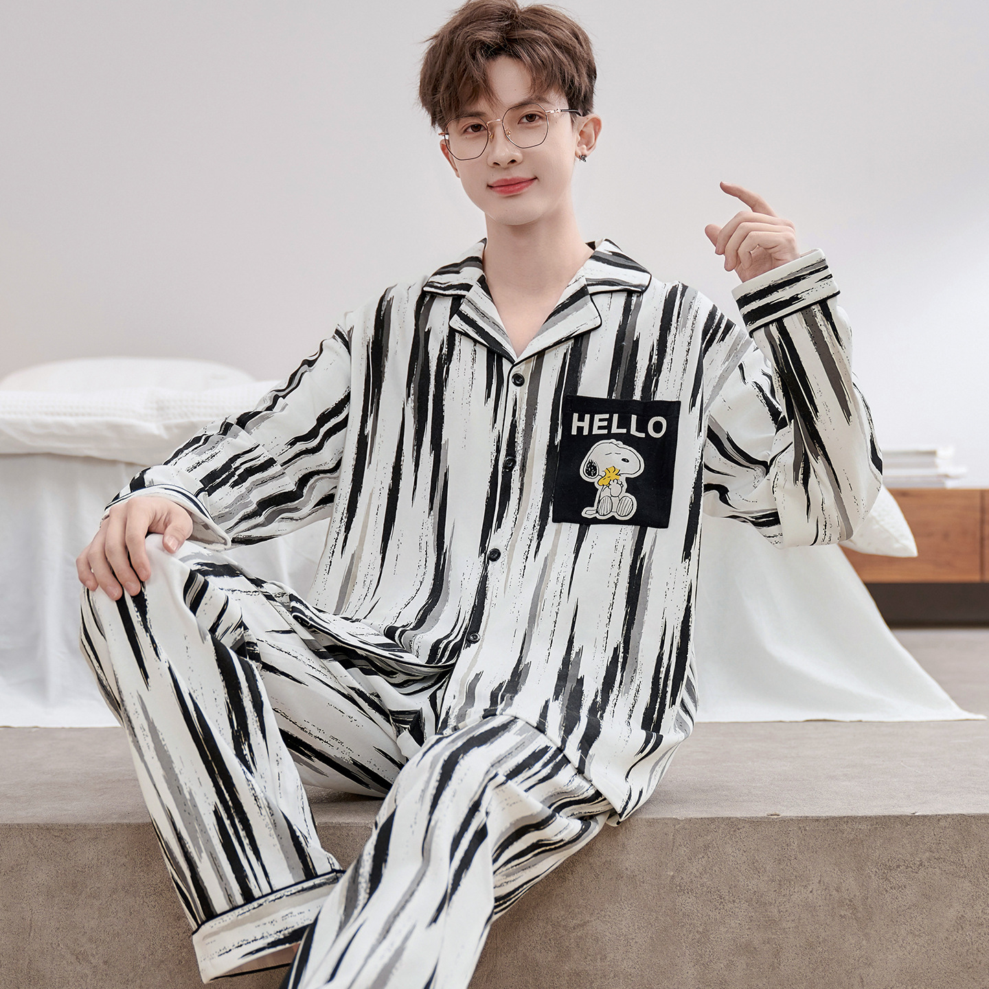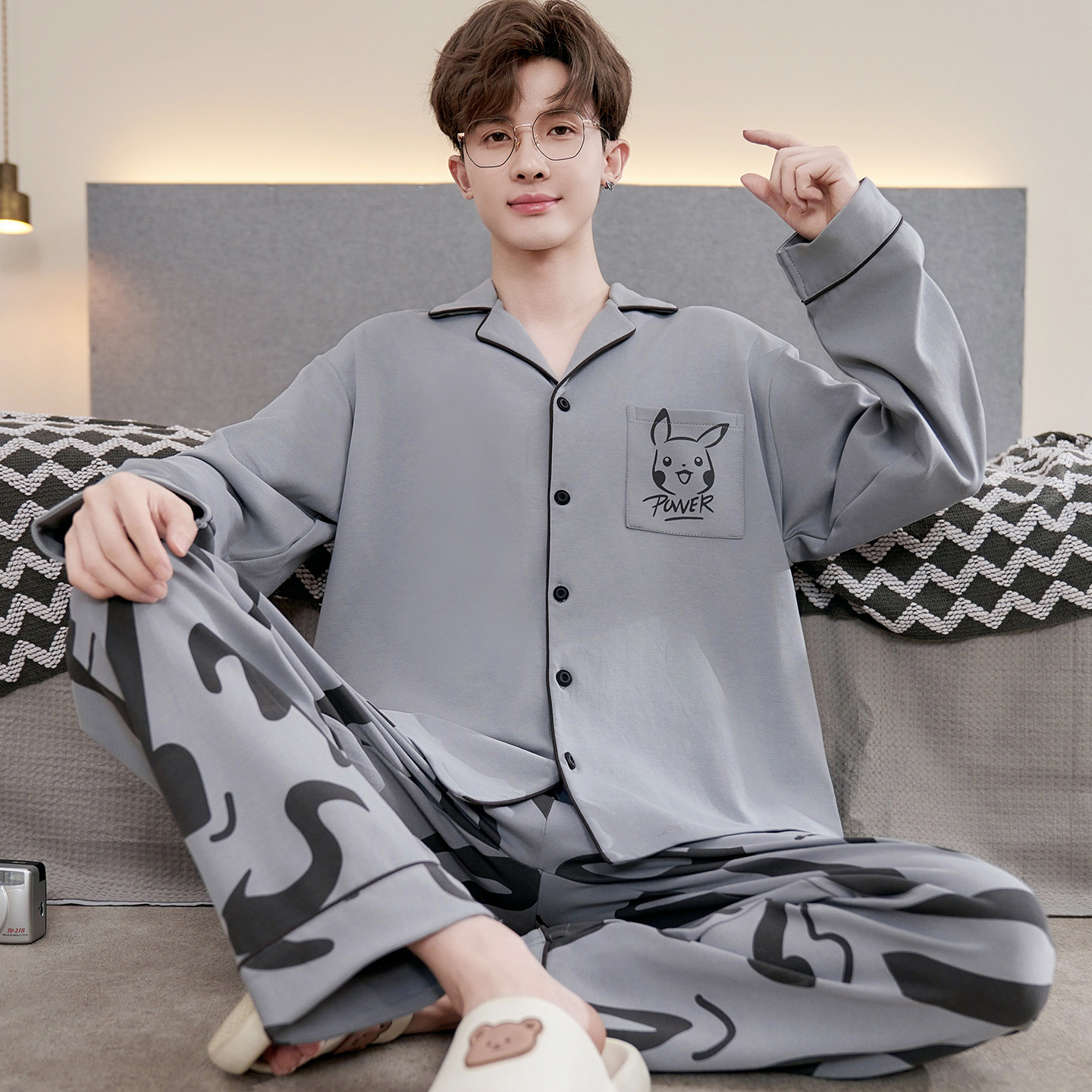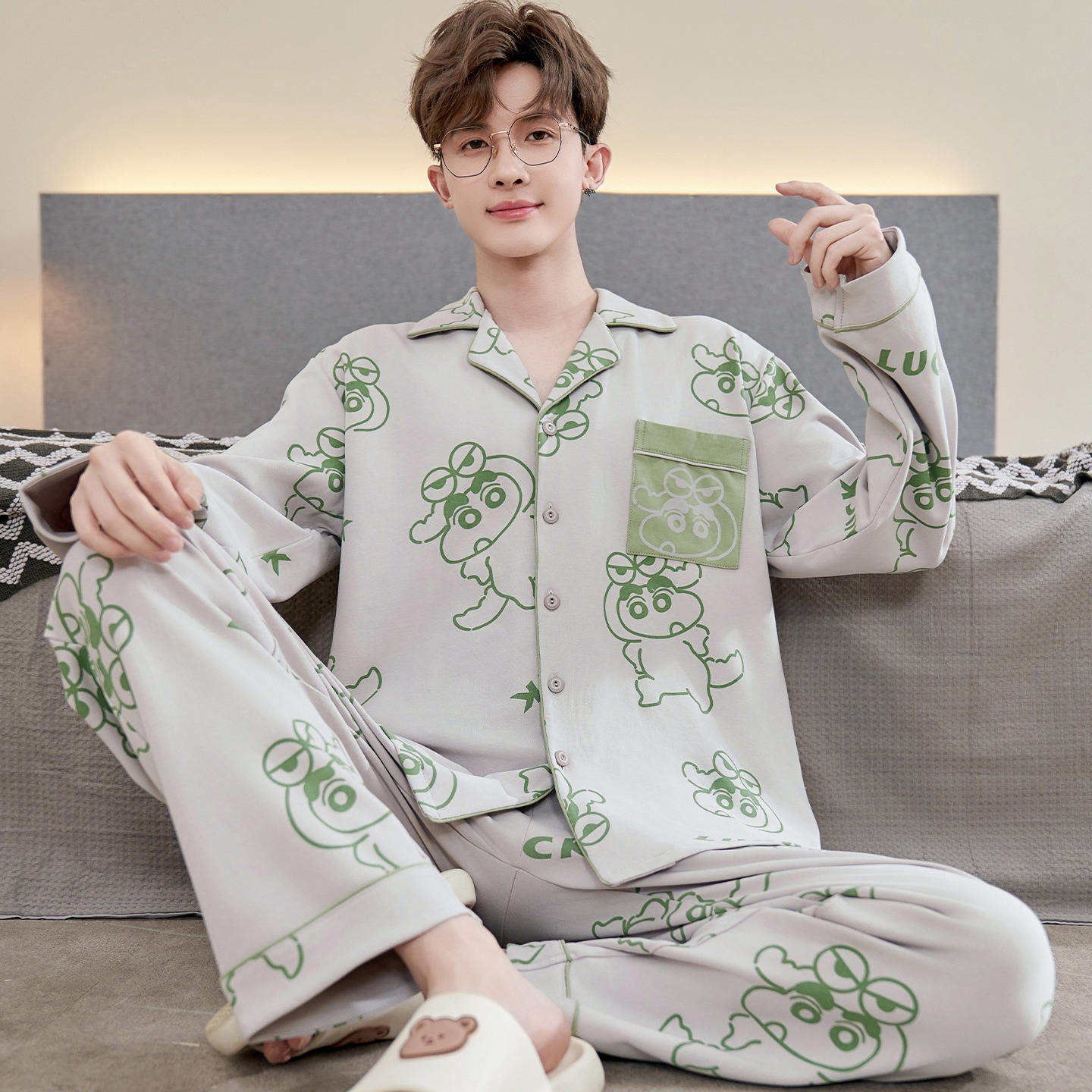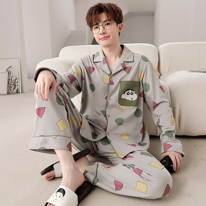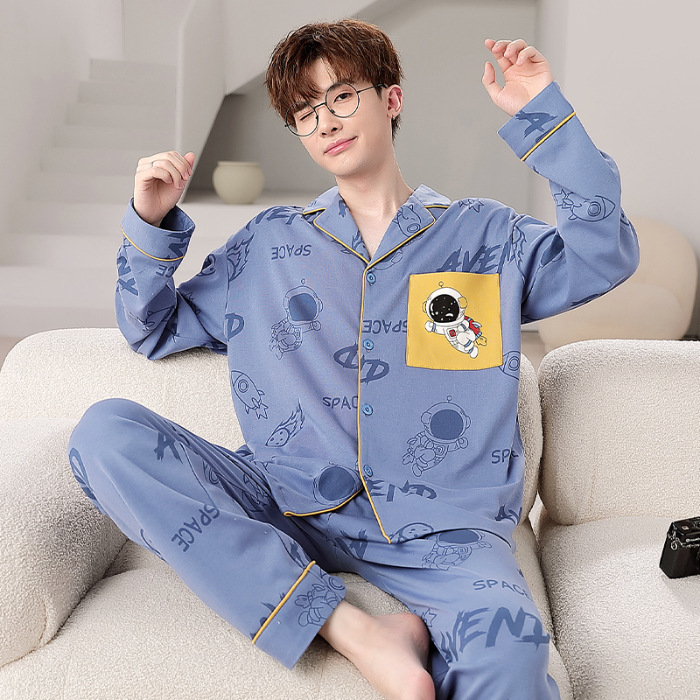 Главная страница > Высокое чувство хлопка пижамы Мужская Весна и Осень Корейская версия кардигана с длинным рукавом бренд Tide молодежь может носить домашнюю одежду костюм