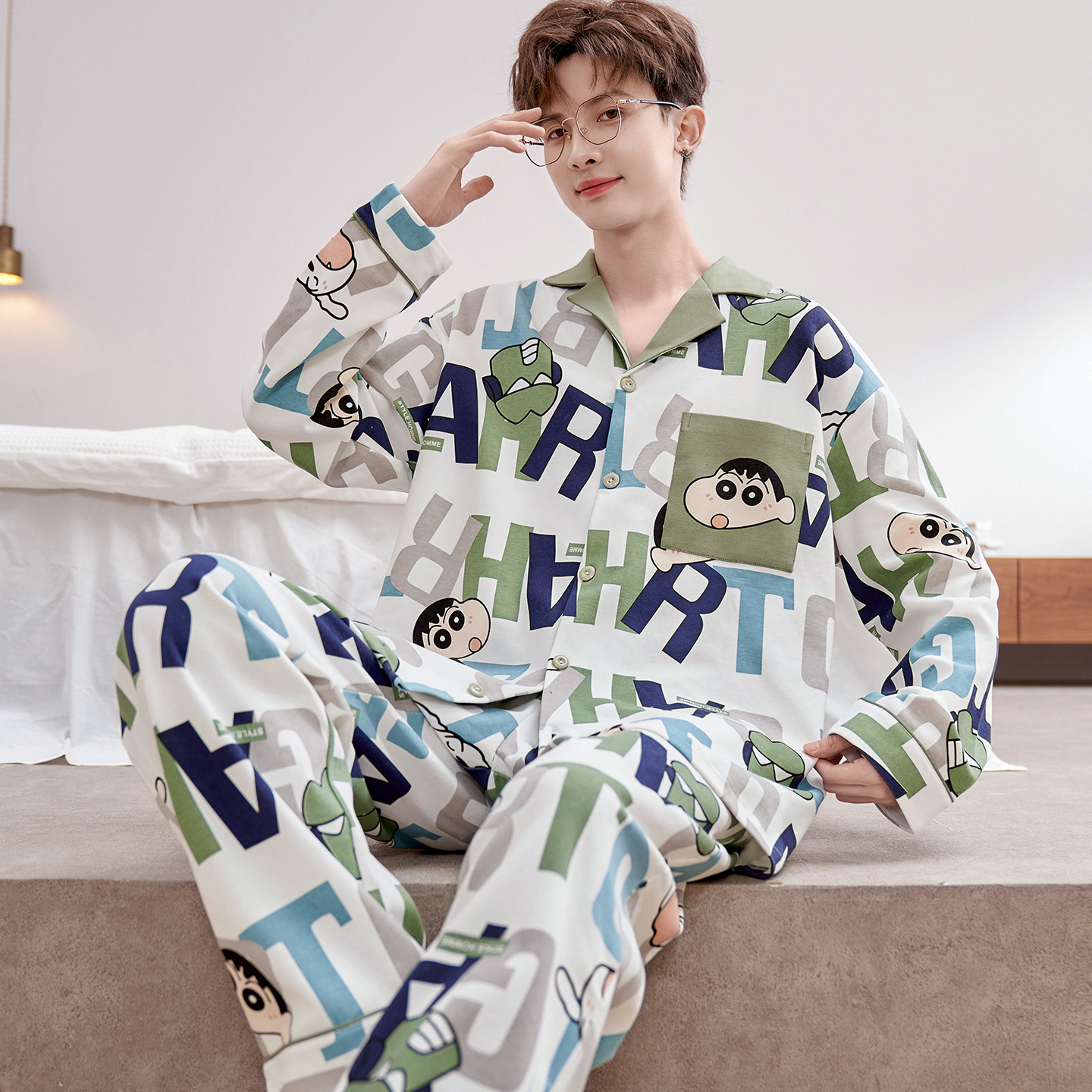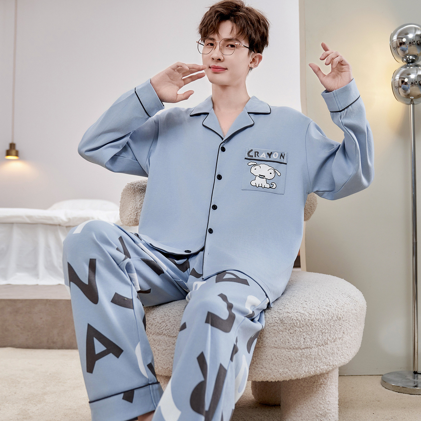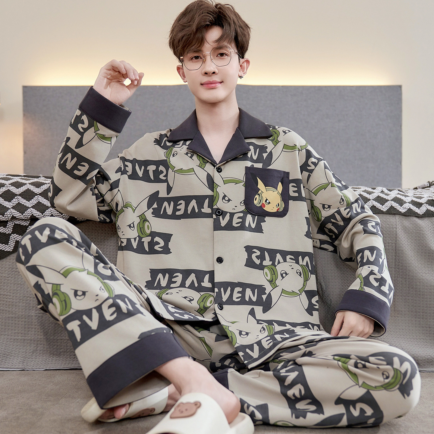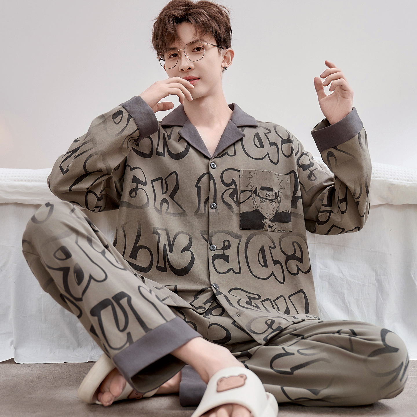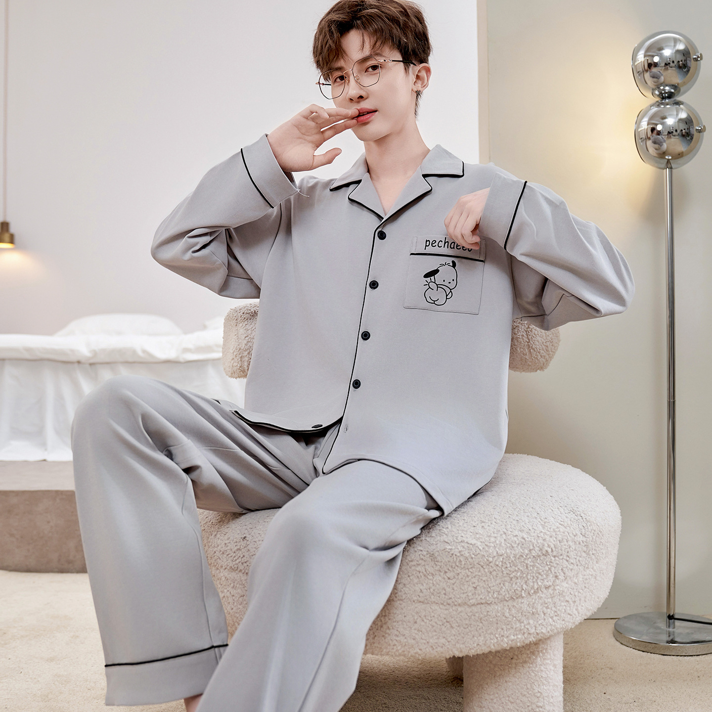 Главная страница > Высокое чувство хлопка пижамы Мужская Весна и Осень Корейская версия кардигана с длинным рукавом бренд Tide молодежь может носить домашнюю одежду костюм