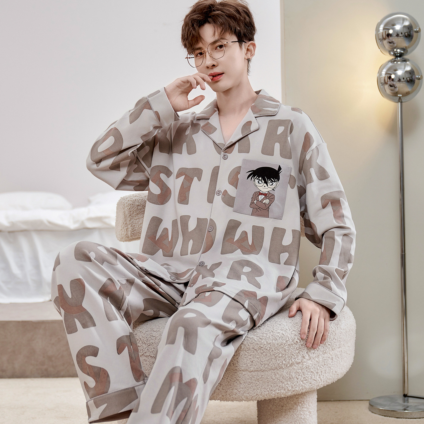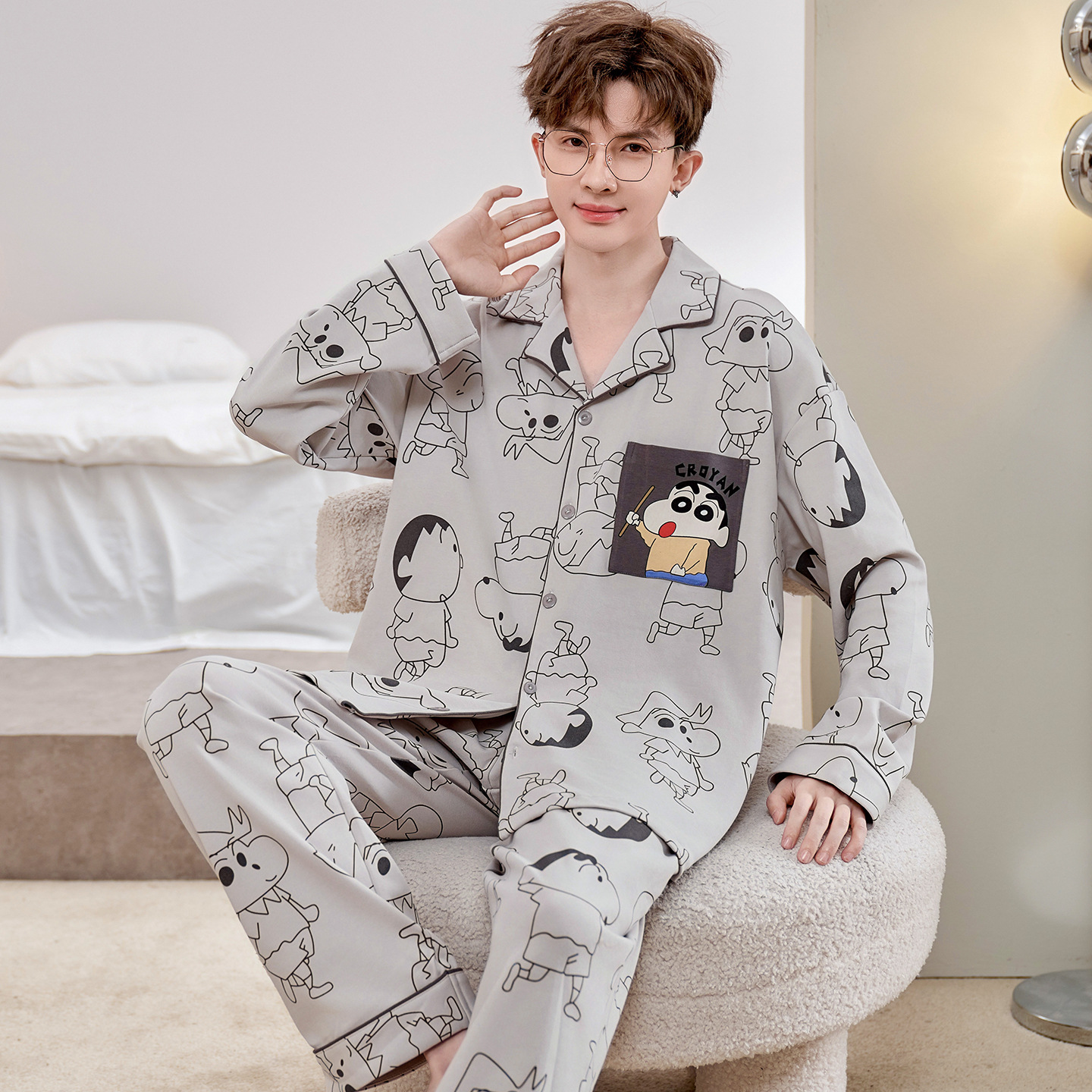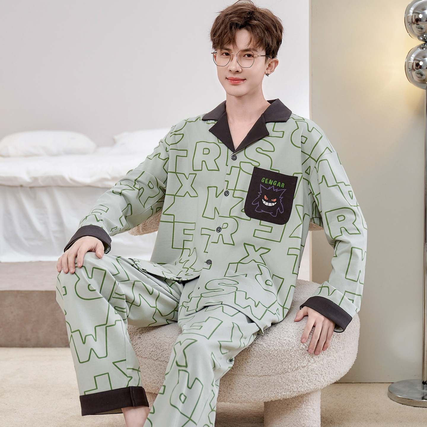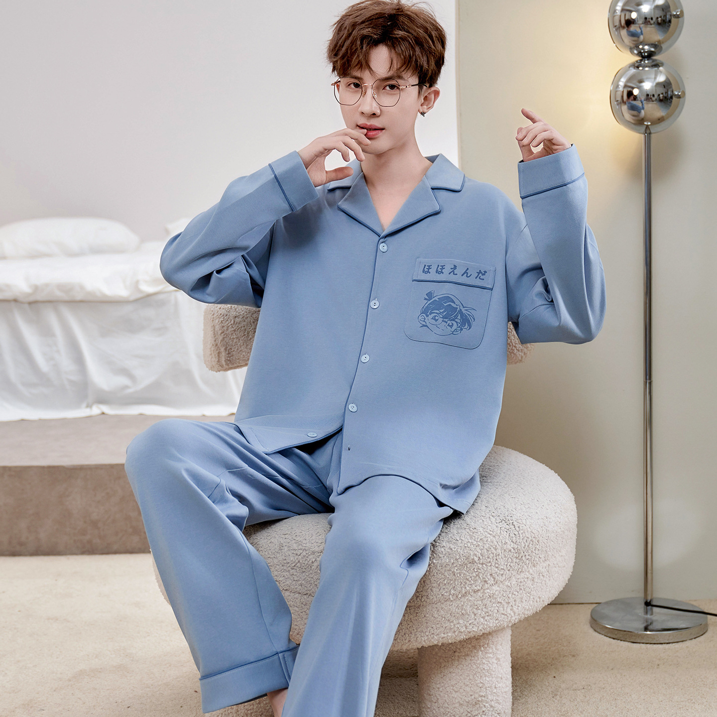 Главная страница > Высокое чувство хлопка пижамы Мужская Весна и Осень Корейская версия кардигана с длинным рукавом бренд Tide молодежь может носить домашнюю одежду костюм