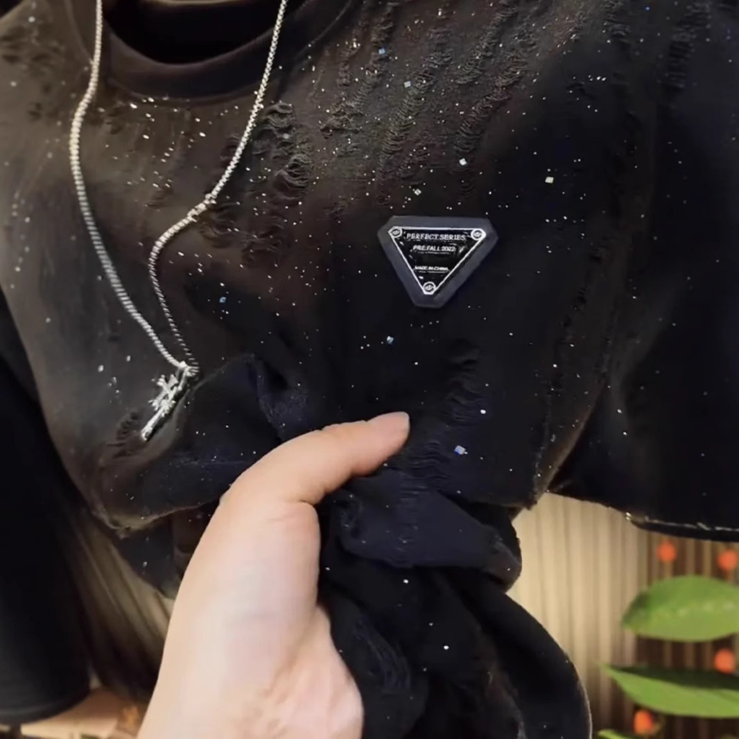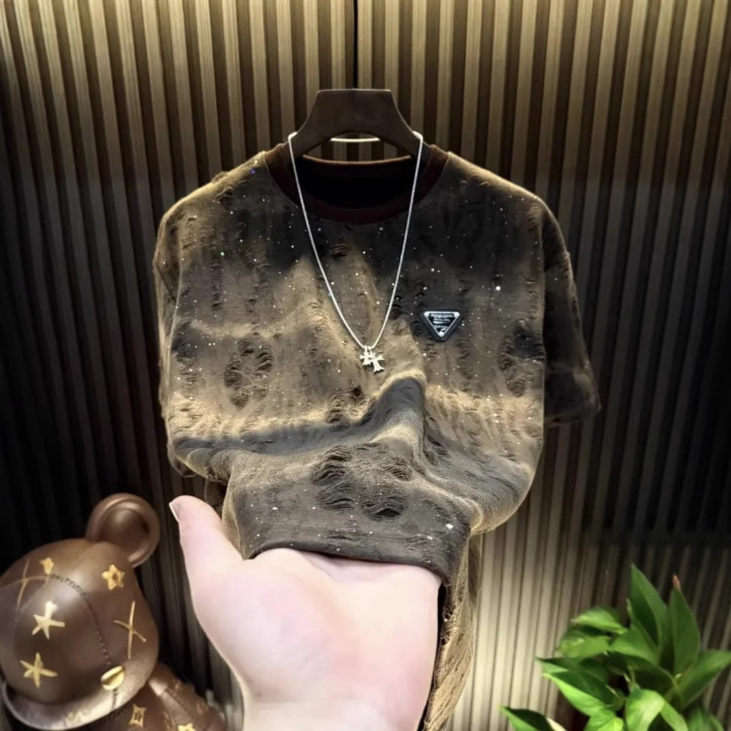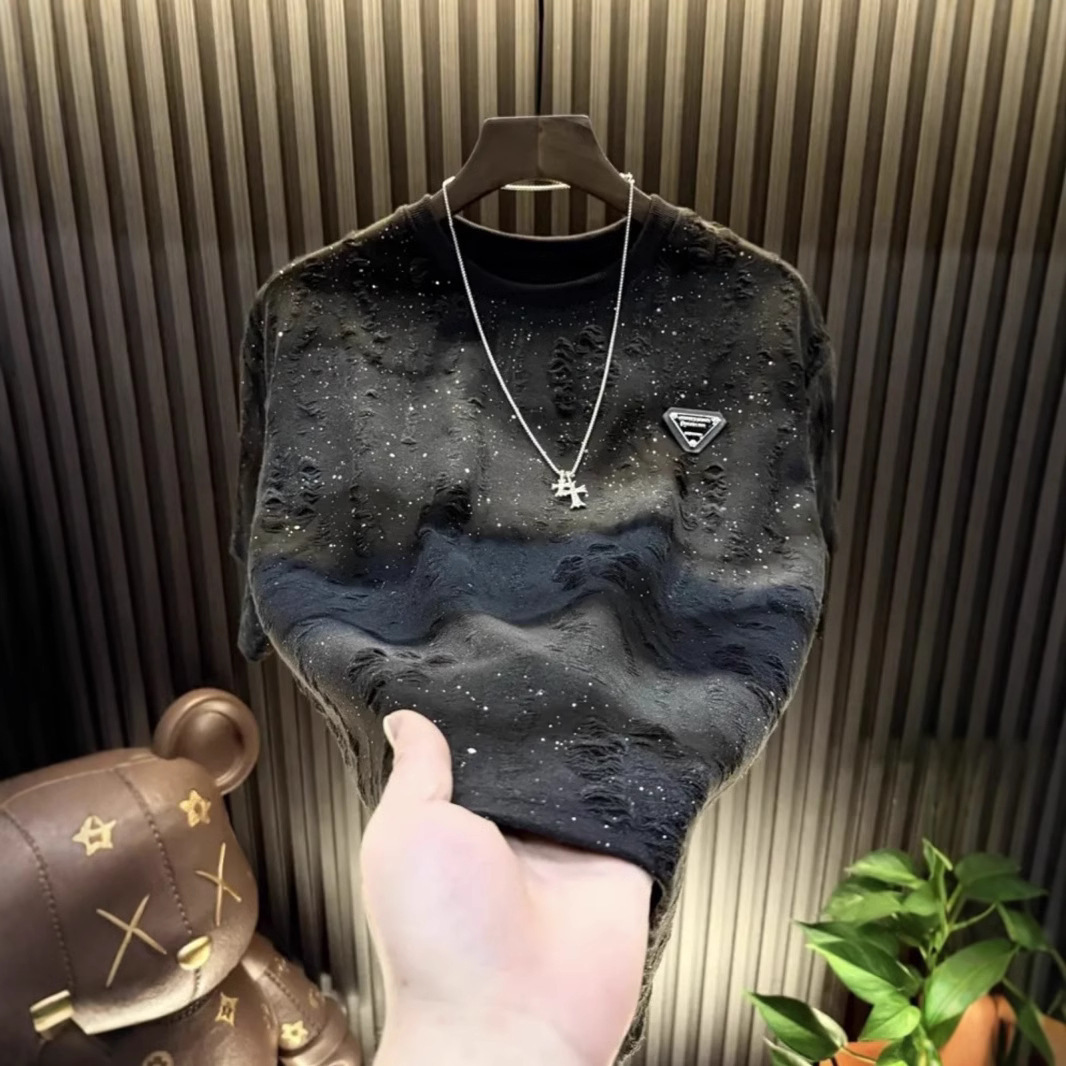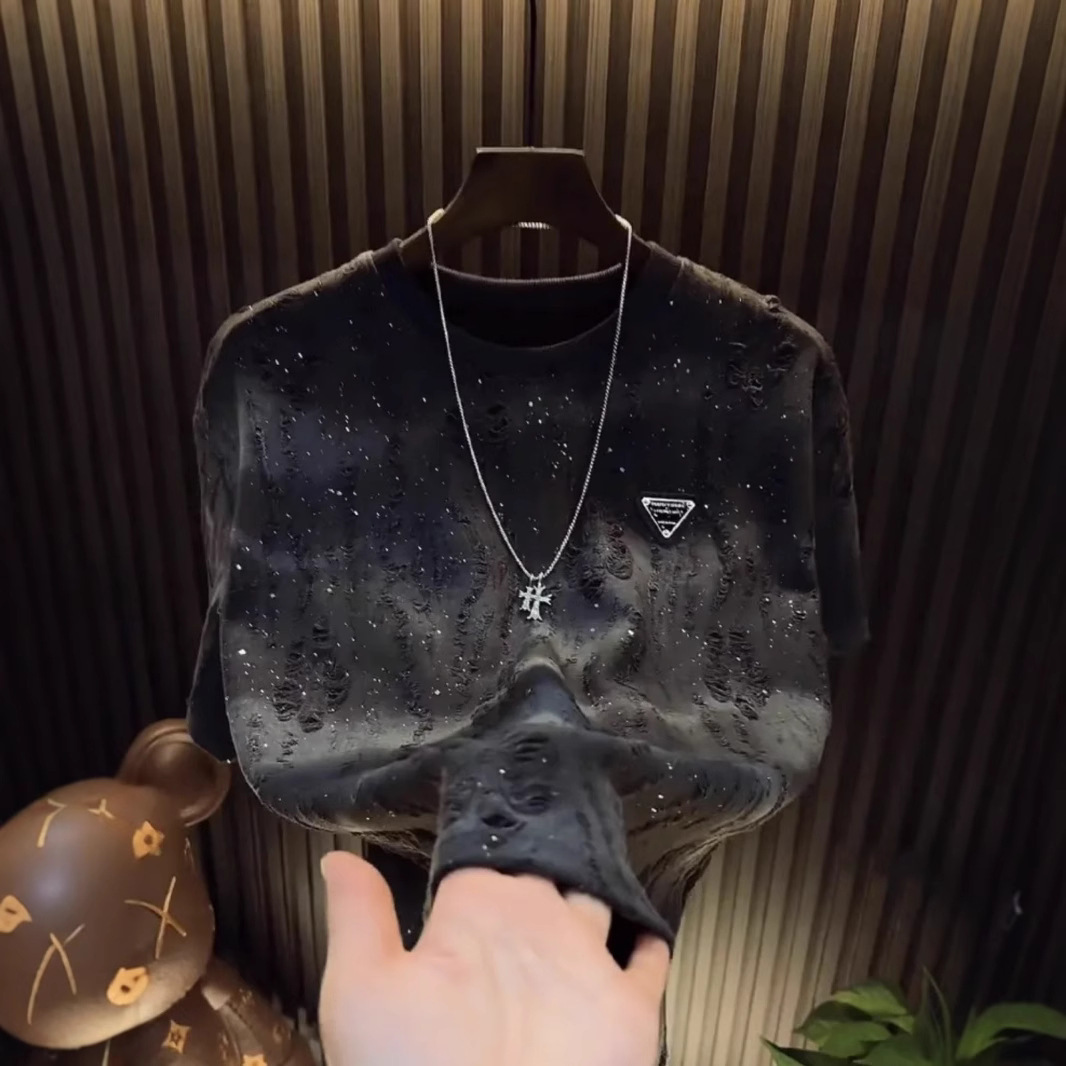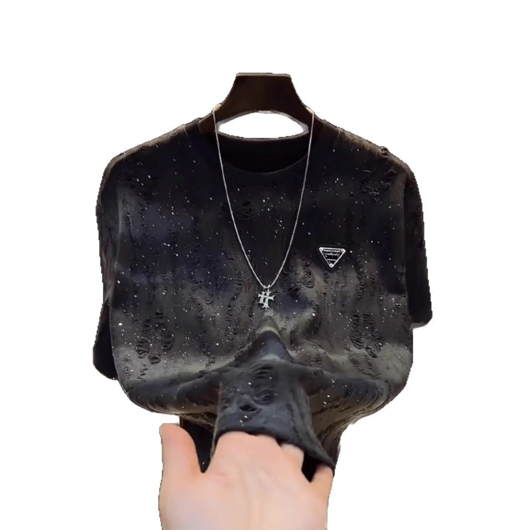 Главная страница > Новая футболка с цветком гипсофилы для мужчин 2025 года, модный бренд, высококачественная майка с круглым вырезом, свободная рваная футболка с коротким рукавом и пайетками.
