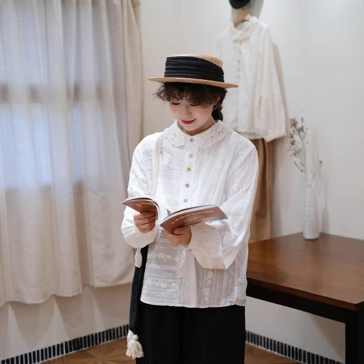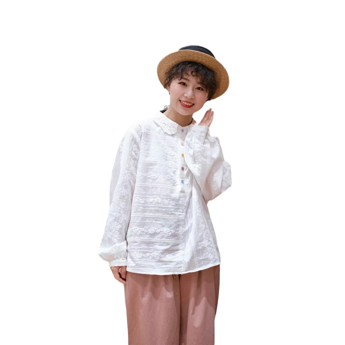 Весенний новый японский сладкий кукольный воротник из хлопчатобумажной цветной пуговицы блузка свободная дикая вышивка минус женская рубашка
