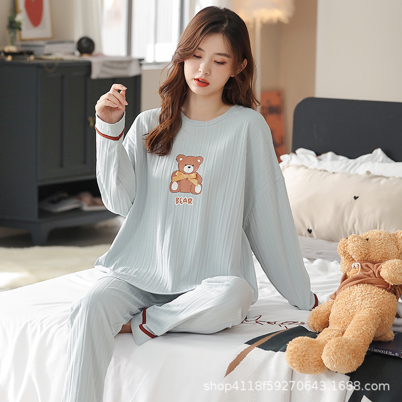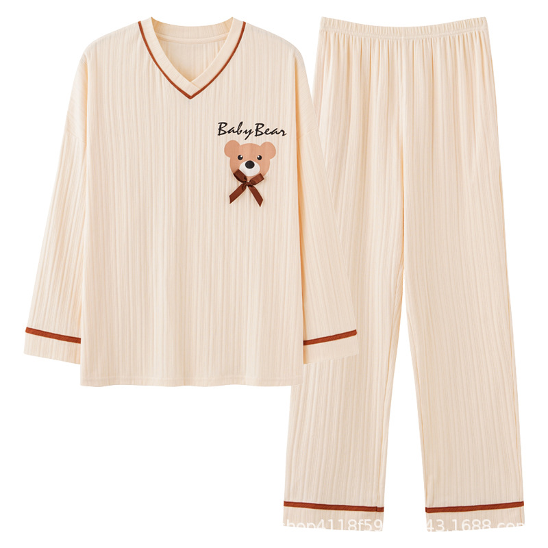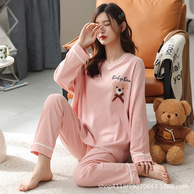 Главная страница > Весенне-осенняя Пижама, Женский хлопковый костюм с V-образным вырезом и длинными рукавами, однотонный свободный костюм с медведем, домашняя одежда больших размеров, женская верхняя одежда