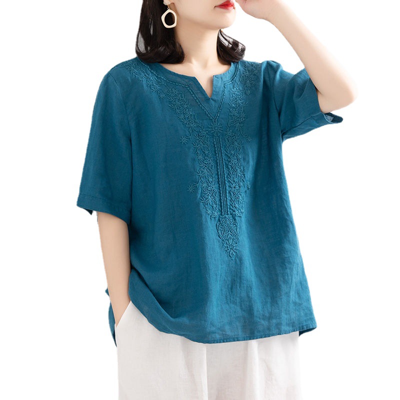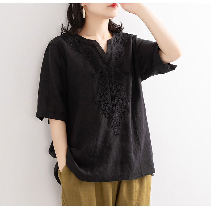 Главная страница > 2023 летняя новая рубашка с вышивкой из хлопка и льна, Женский художественный Свободный пуловер, короткая вышитая Футболка больших размеров на пуговицах с V-образным вырезом и V-образным вырезом
