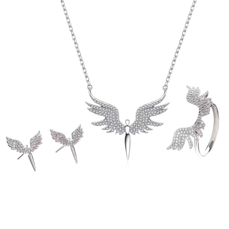 Главная страница > Серебряный титановый стальной ювелирный набор Горячая продажа Хранитель Ангела Крылья Ожерелье Серьги Кольцо Цветные бриллианты не выцветает