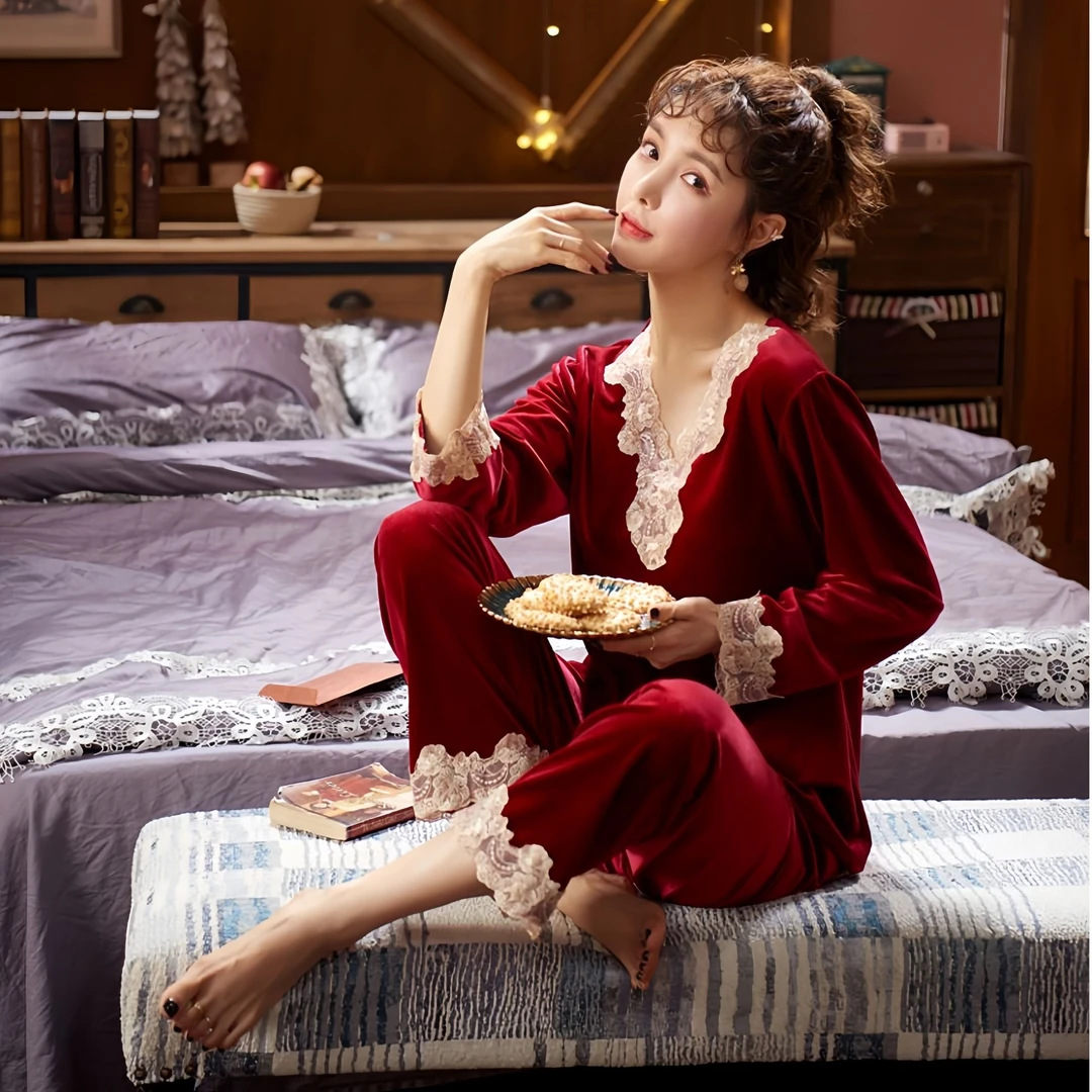 Теплые бархатные пижамы Da Vinci Code, осенне-зимний стиль, корейская версия, можно носить на улице, домашняя одежда, кружевной женский комплект из двух предметов
