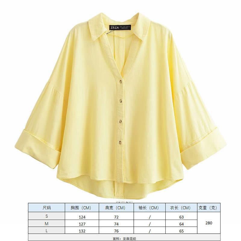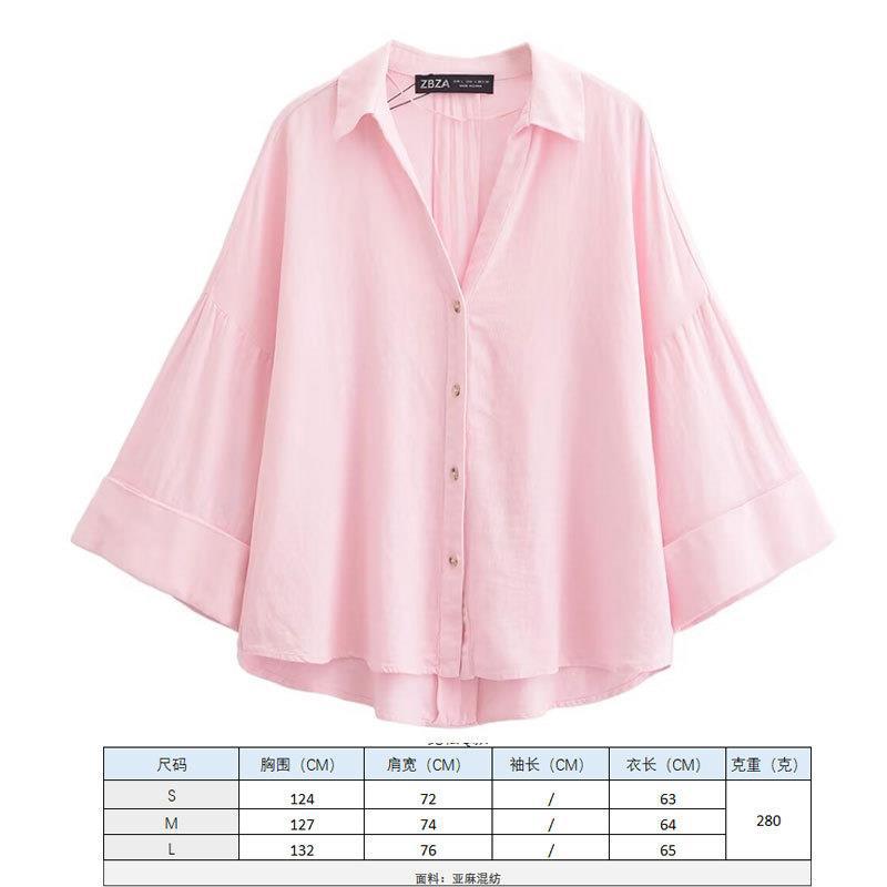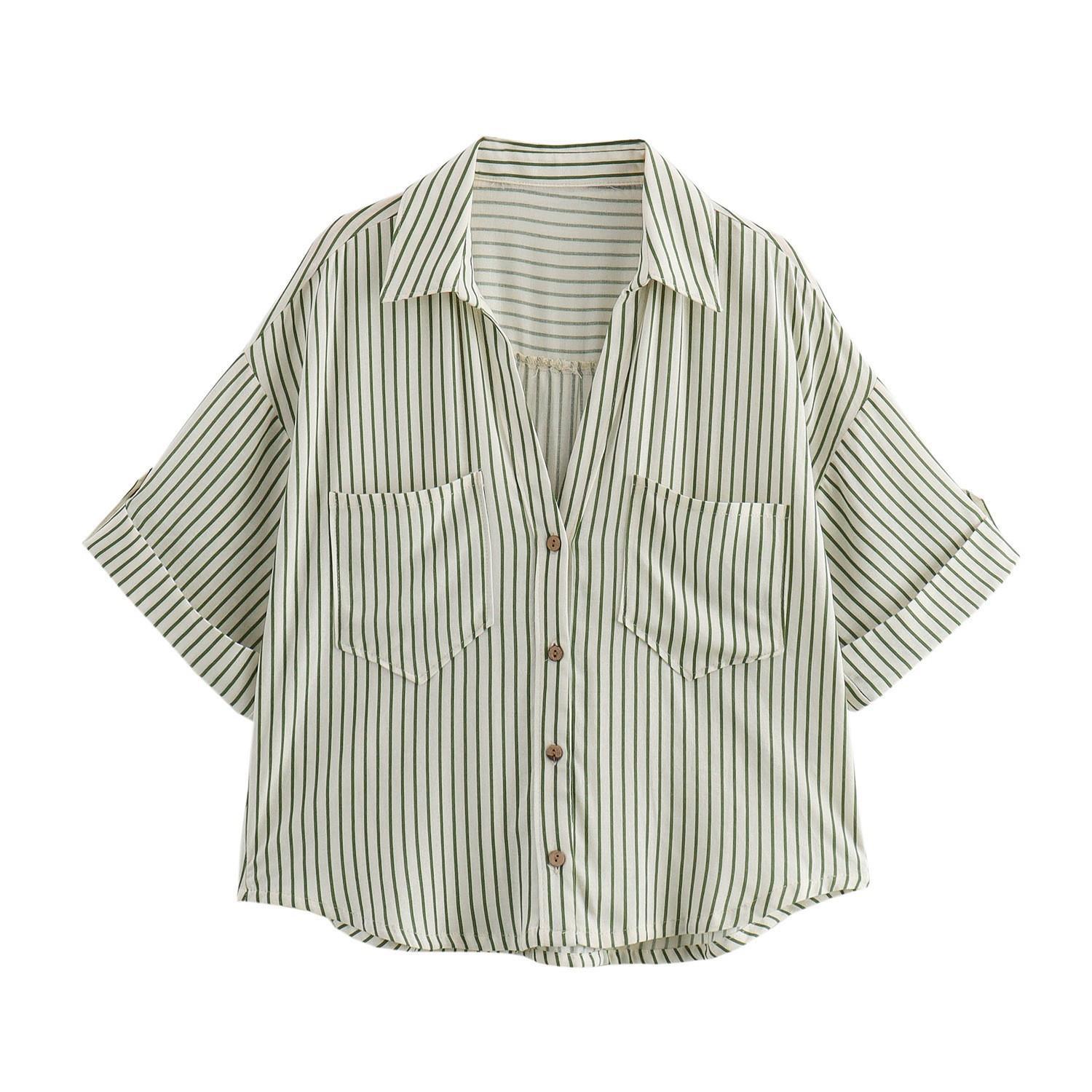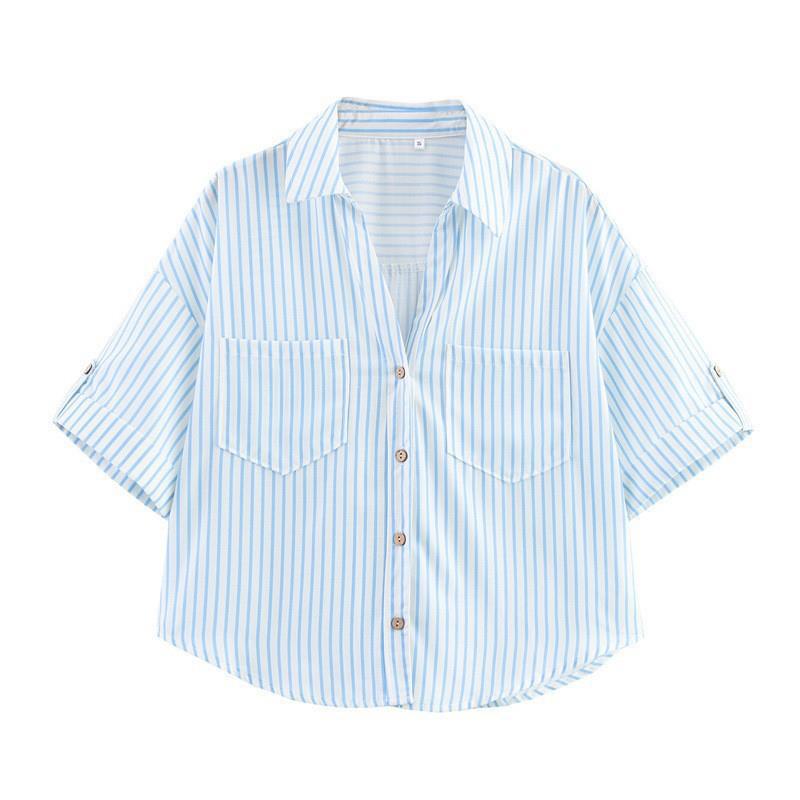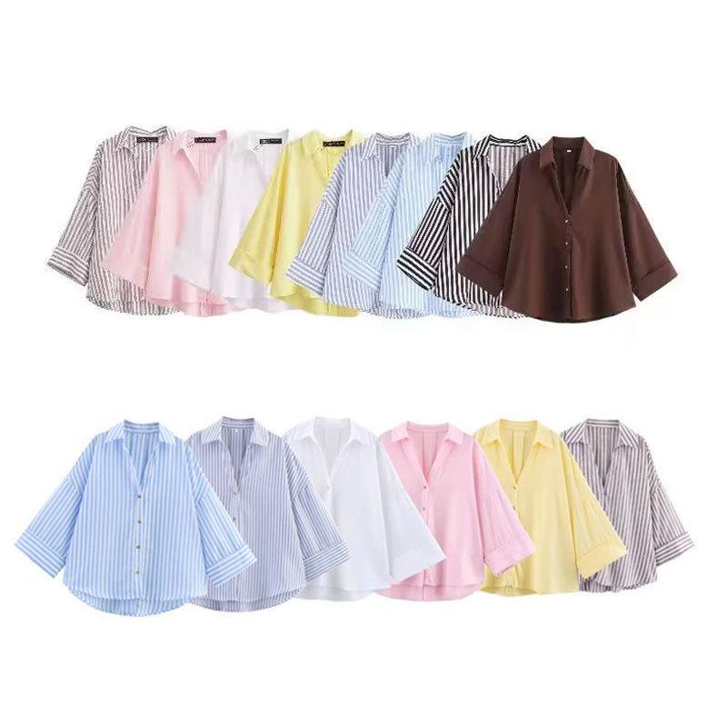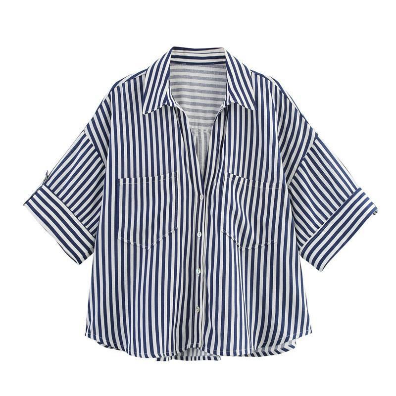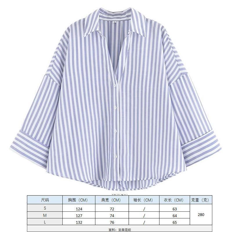 Главная страница > Универсальная и модная повседневная женская рубашка в полоску в европейском и американском стиле, свободного кроя, с рукавом три четверти, из хлопка и льна, с воротником, летняя.