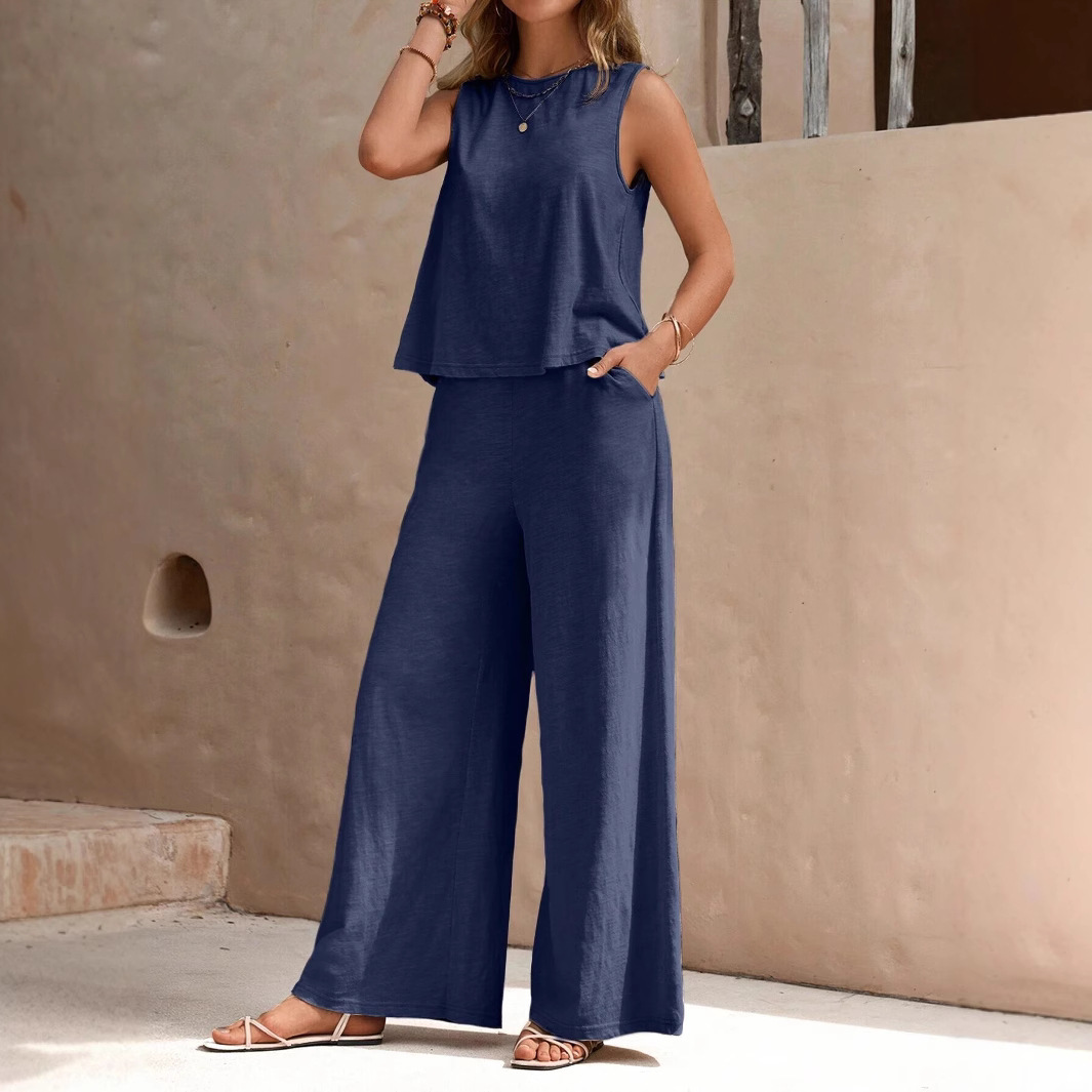 Главная страница > Новый набор из двух частей летом 2025 года женский европейский и американский тренд дикий свободный чехол с круглым вырезом повседневный хлопковый костюм женский