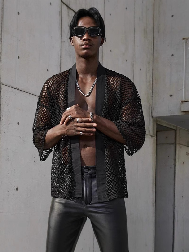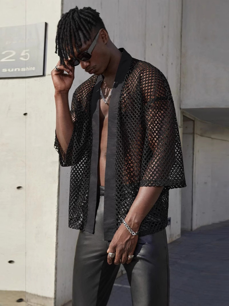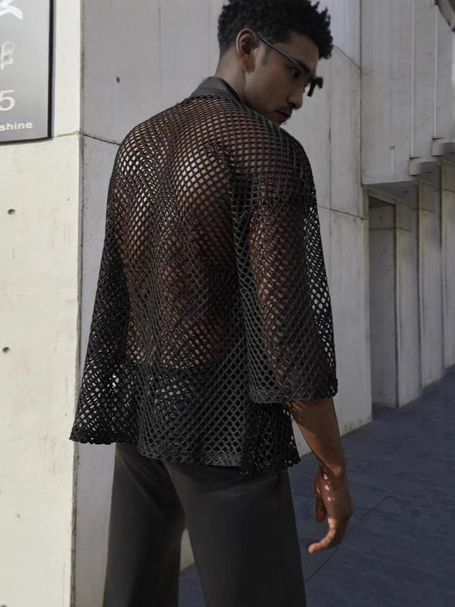Главная страница > Хит продаж, мужская футболка с вырезами в европейском и американском стиле, мужской сексуальный сетчатый кардиган, шаль, модная одежда для выступлений, верхняя рубашка 8003