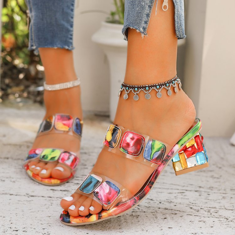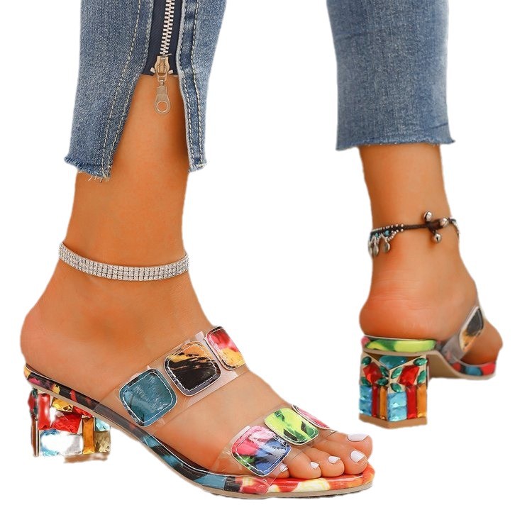 Конфеты цвета женские тапочки на высоком каблуке летние новые толстые каблуки бриллианты красочные блестки женские прохладные и удобные оптом