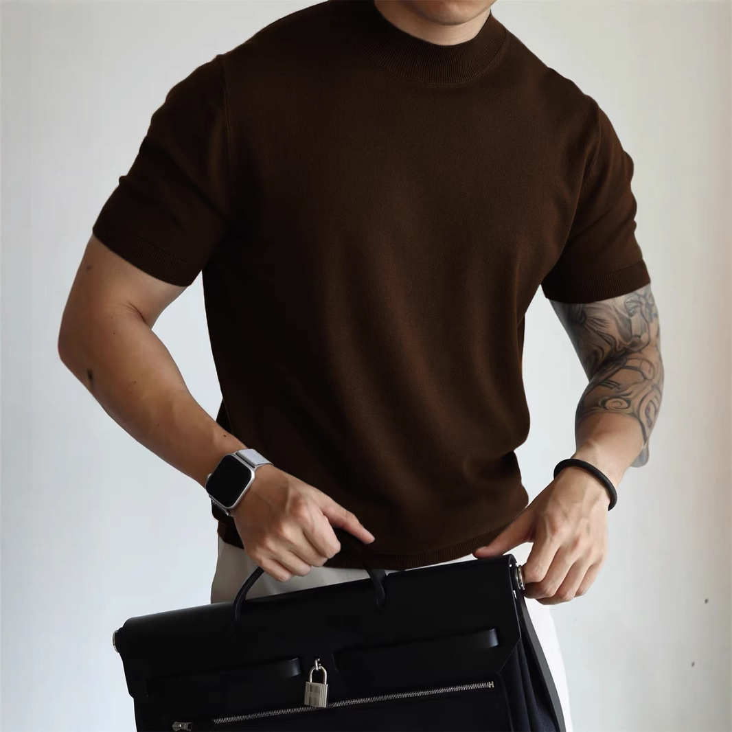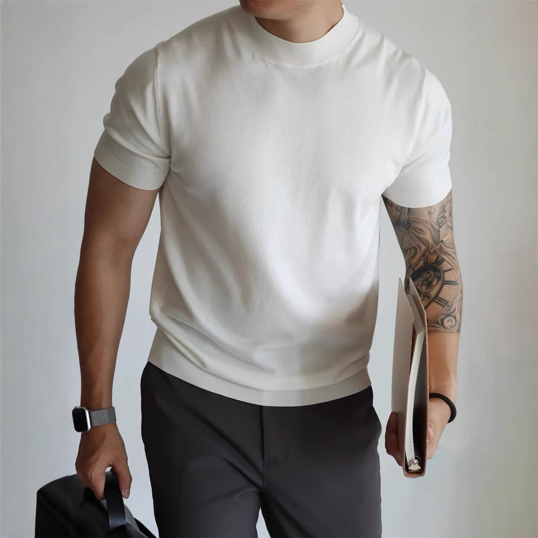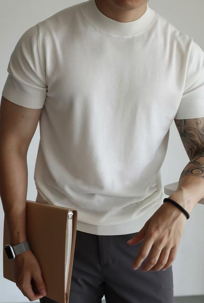 Трикотажная футболка с короткими рукавами с половинным воротником для мужчин 2025 новый премиум-стиль белый тонкое тело, тонкое тело, стиль ретро топ