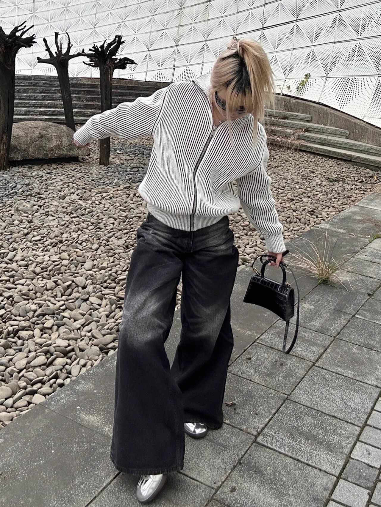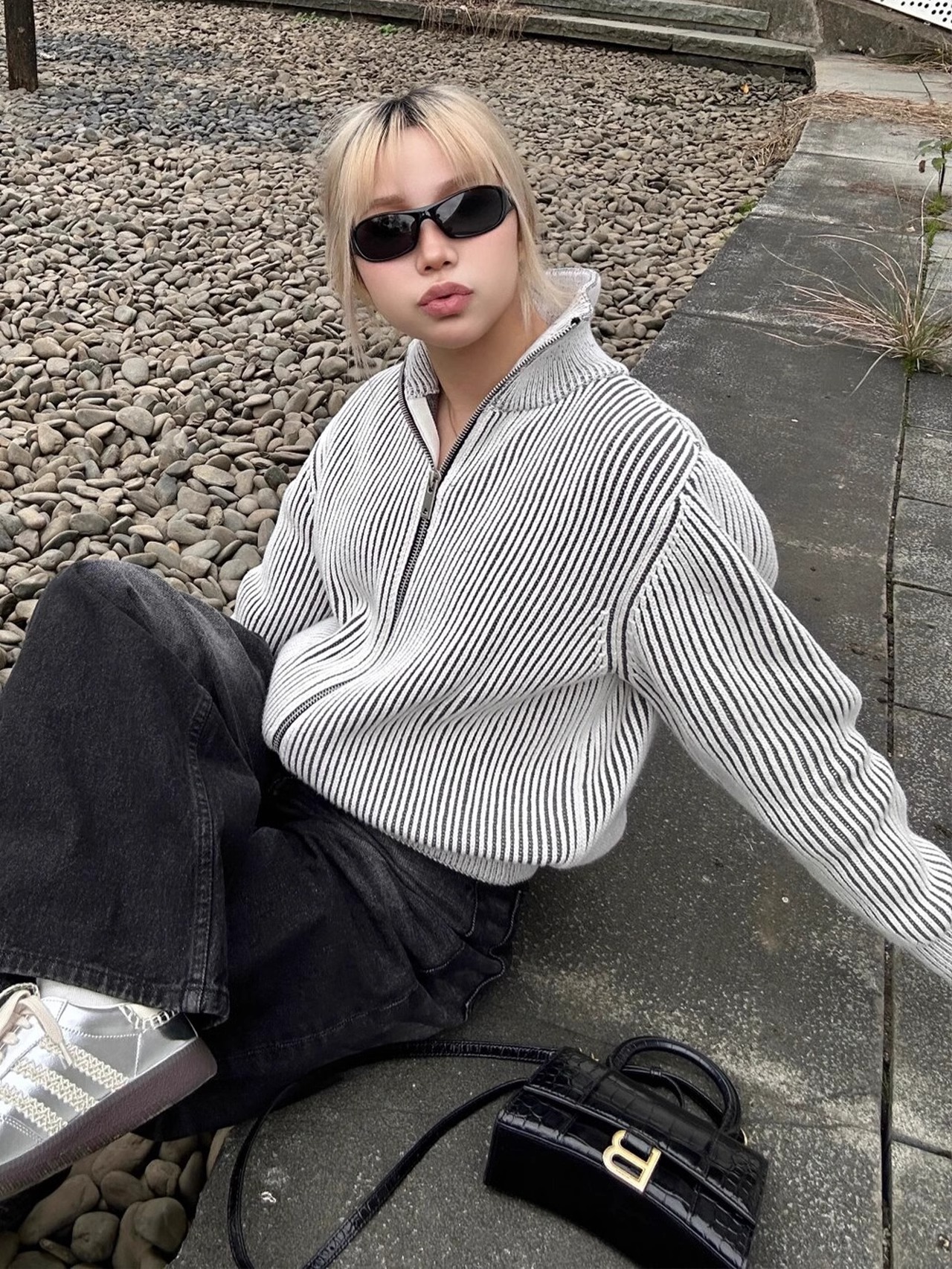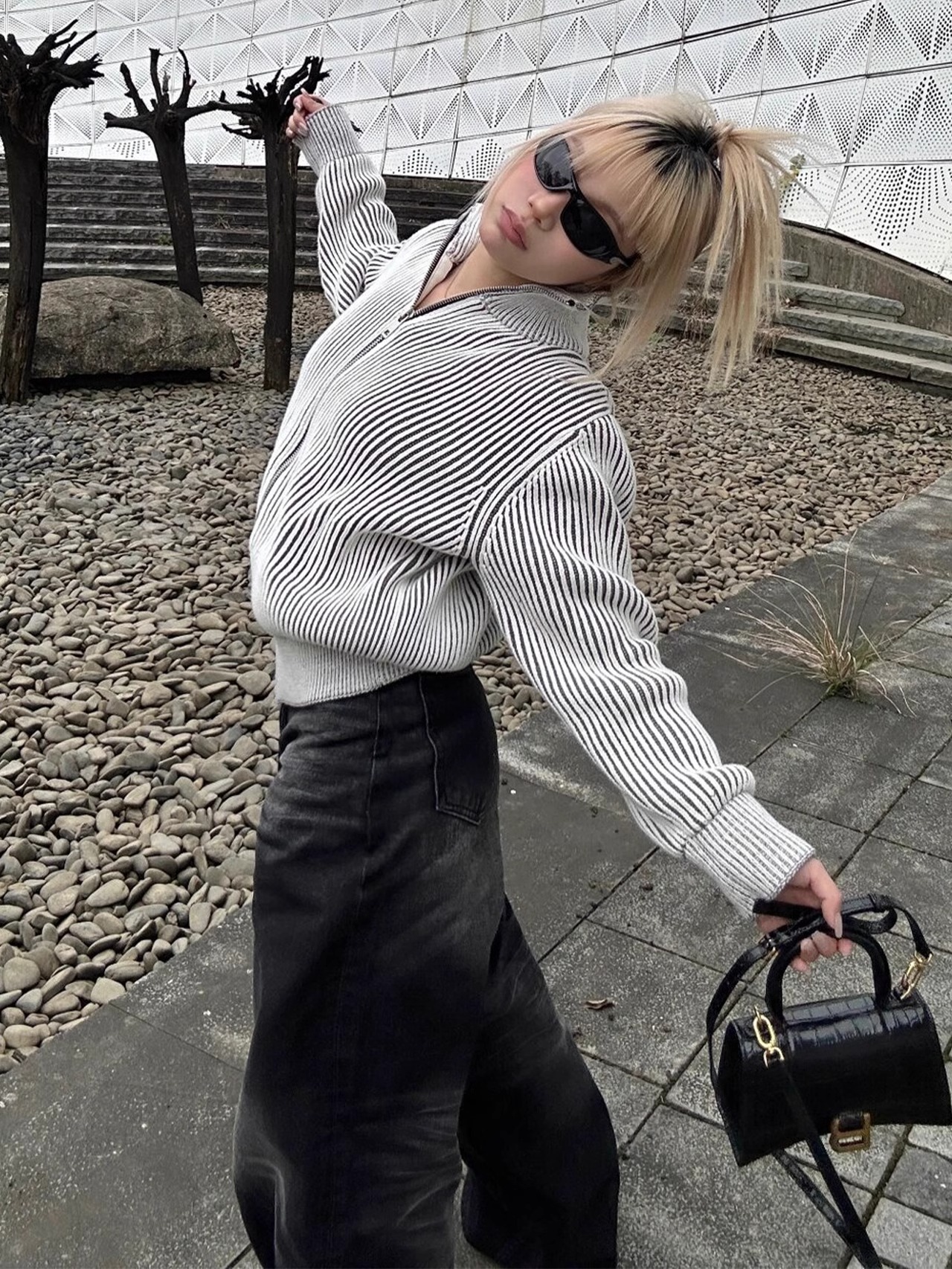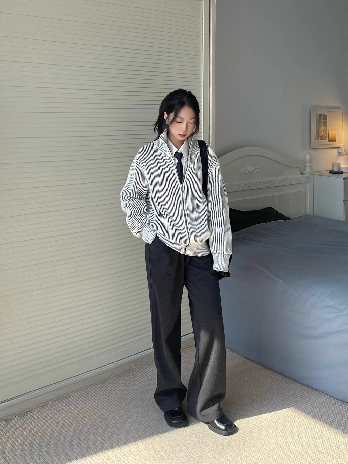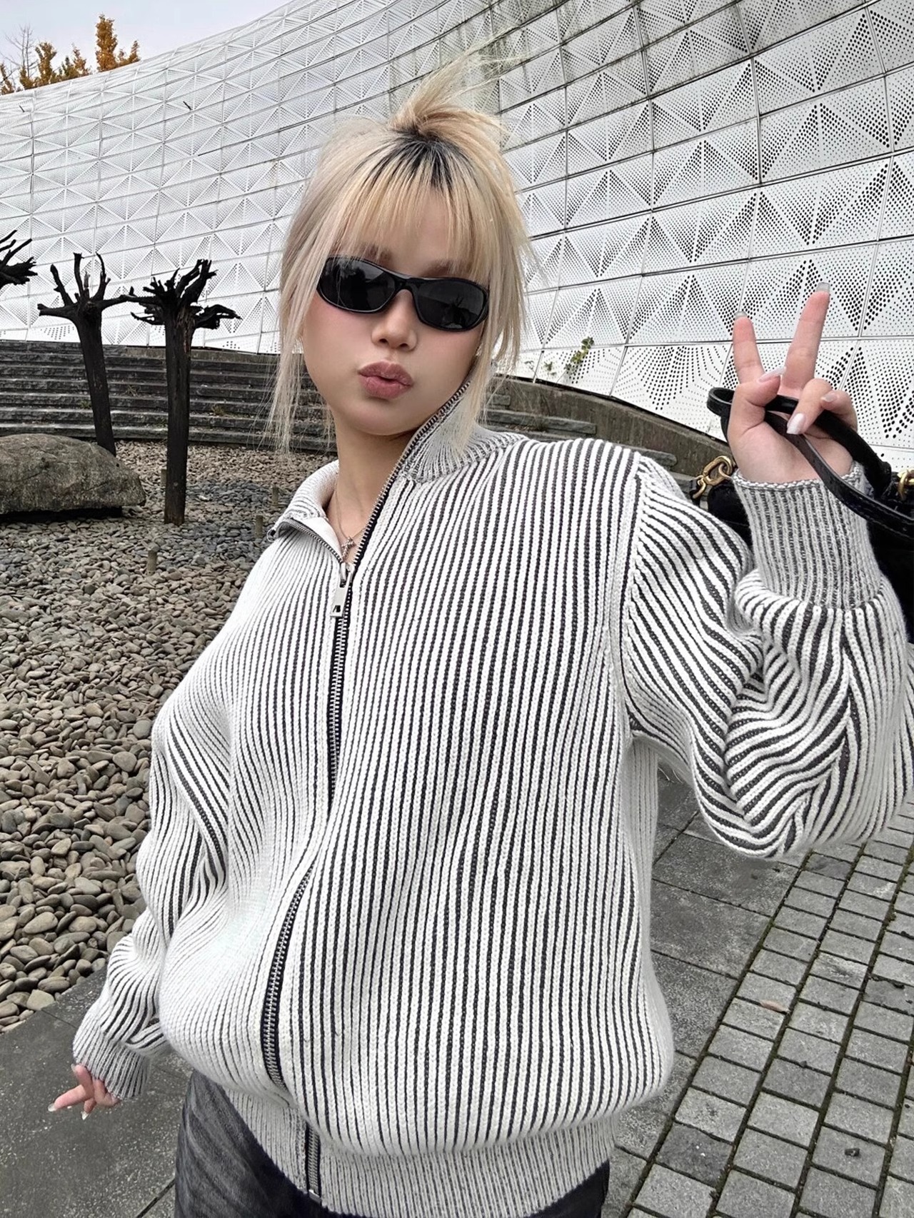 Главная страница > Белый и серый тяжелый свитер на молнии с воротником-стойкой, толстый вязаный кардиган в полоску, свободная куртка для мужчин и женщин, свободный топ, модный
