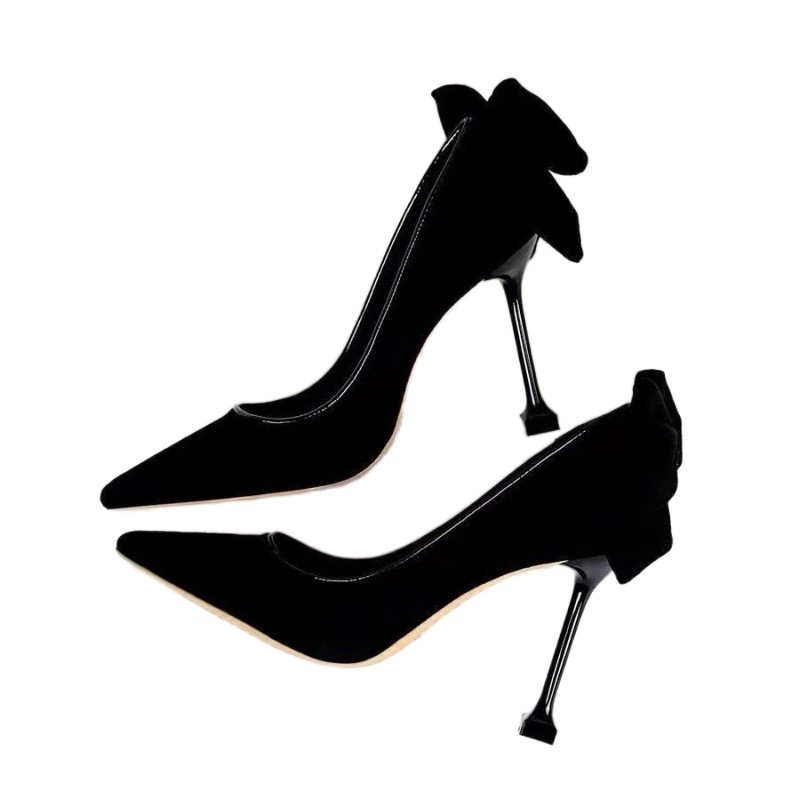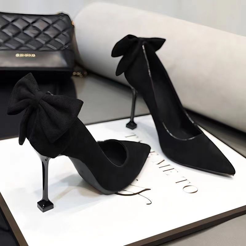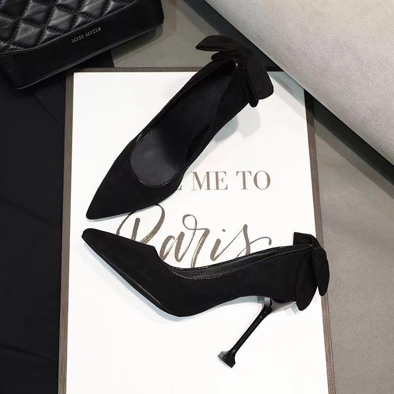 Заостренный туфли на высоком каблуке черный профессиональный женский корейский вариант полый женский каблук замши