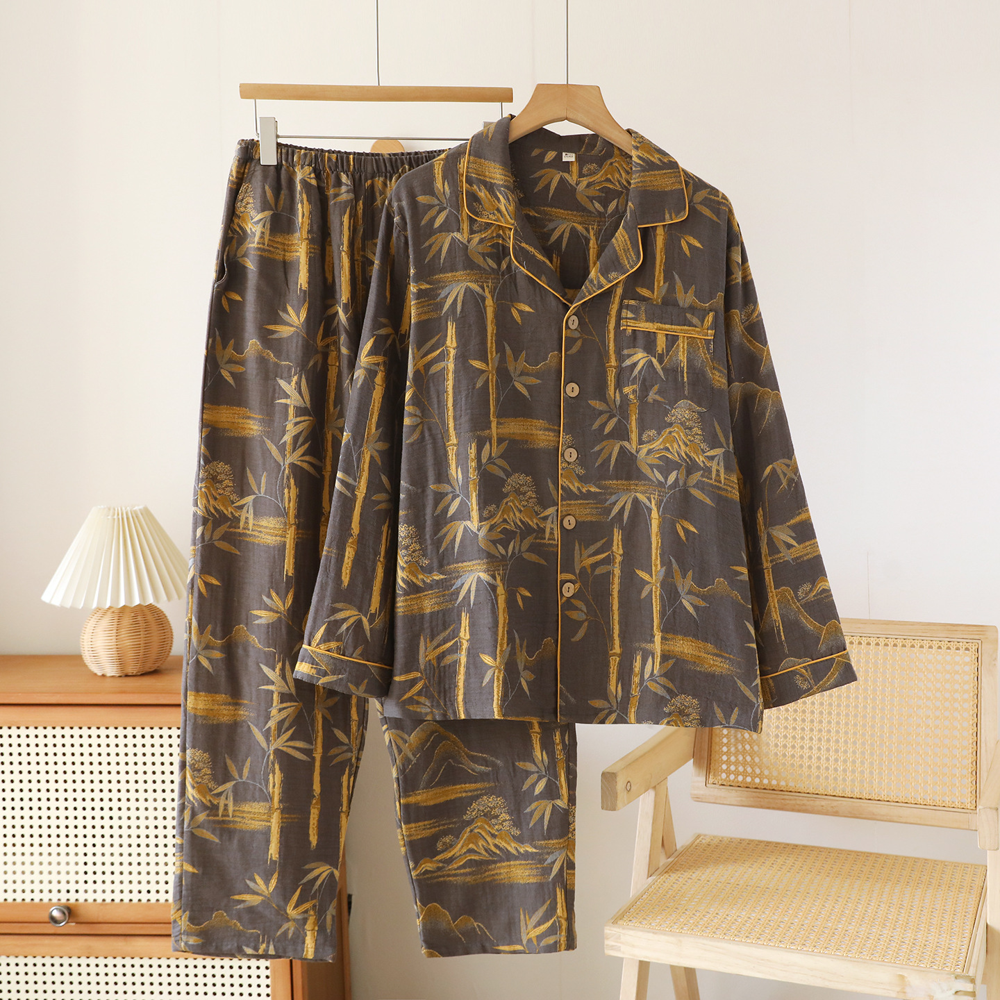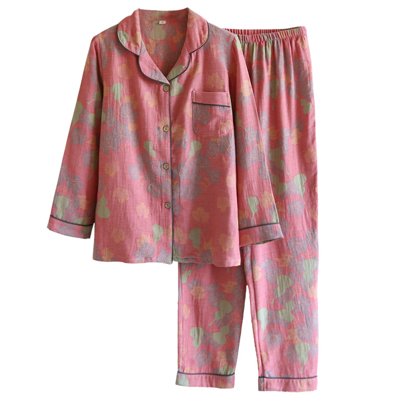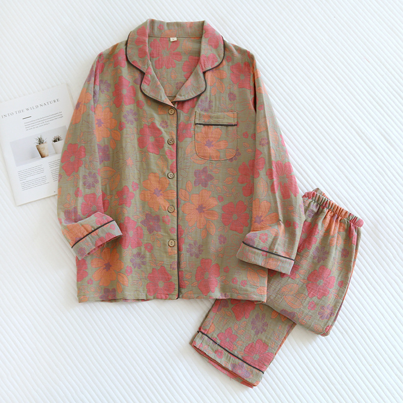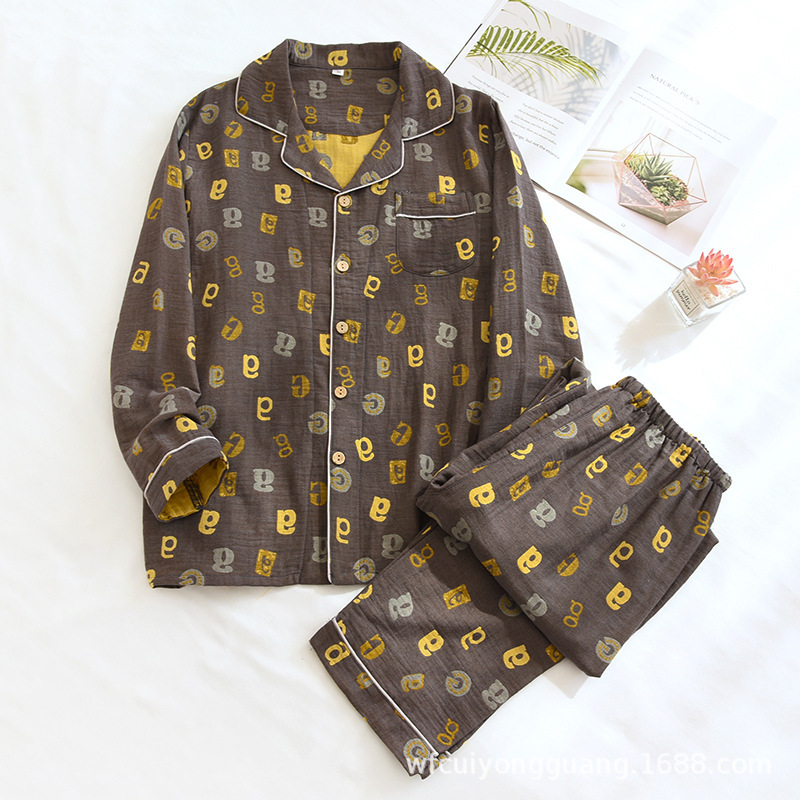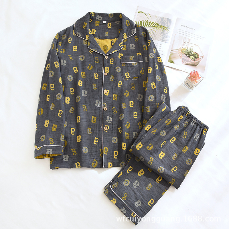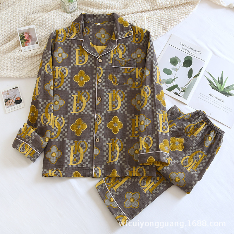 Главная страница > Пижама для пар, Женская весенне-осенняя тонкая окрашенная пряжа, двухслойные марлевые брюки с длинными рукавами, кардиган, мужской повседневный костюм для дома