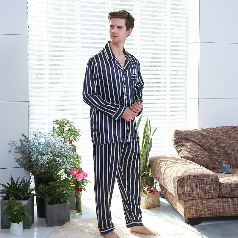 Главная страница > Трансграничная Осенняя мужская пижама в шелковую полоску, Мужская шелковая тонкая Домашняя одежда с длинными рукавами и принтом, костюм 89011