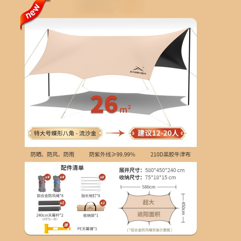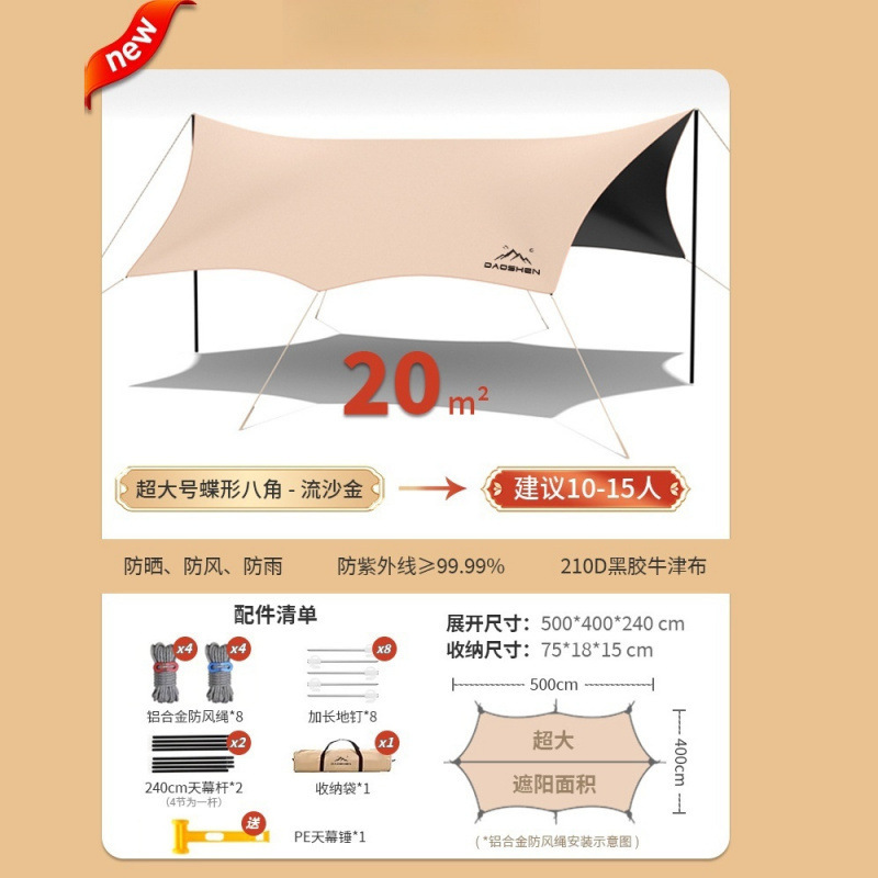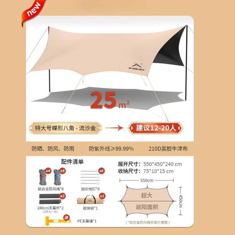 25 ㎡ Quicksand Gold [Усиливающая стойка высотой 2,4 м + восьмиугольная виниловая форма бабочки + 5 слоев утолщения + солнцезащитный крем, водонепроницаемый и ветрозащитный] Очень большой / рекомендуется для 12–20 человек