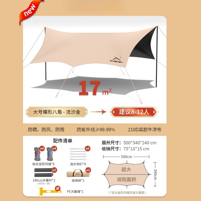 17 ㎡ Quicksand Gold [Усиливающая стойка высотой 2,4 м + восьмиугольная виниловая бабочка + 5 слоев утолщения + солнцезащитный крем, водонепроницаемый и ветрозащитный] Большой размер / рекомендуется для 8–12 человек