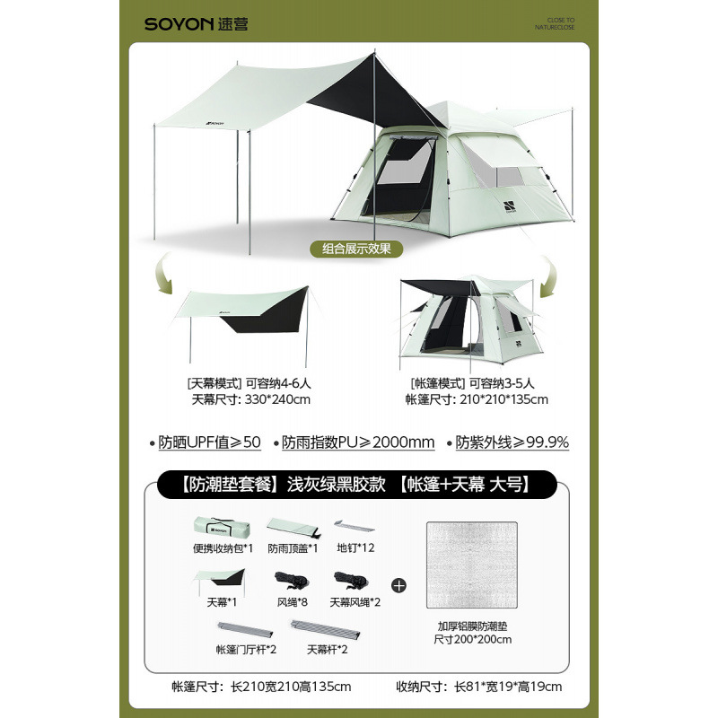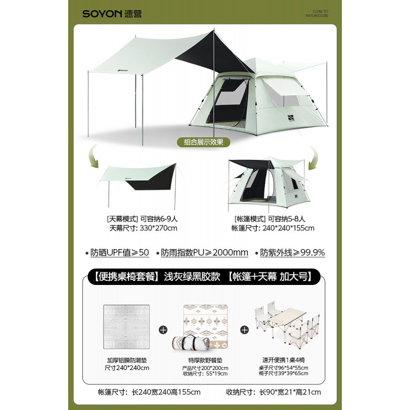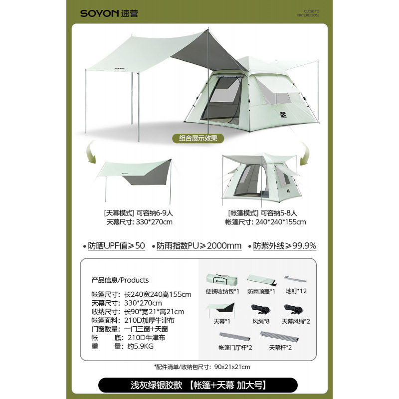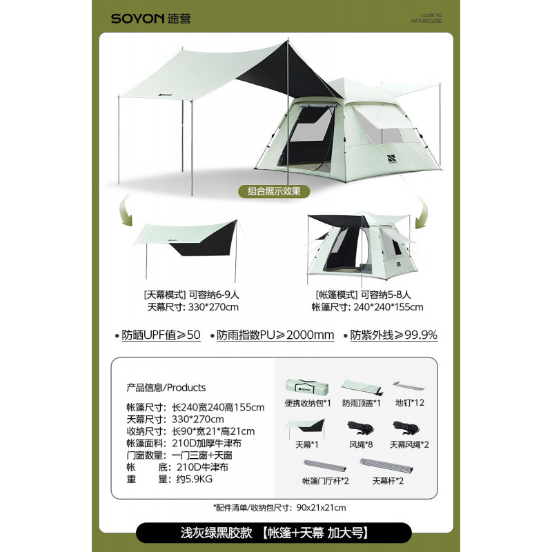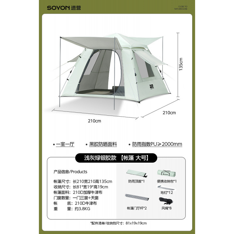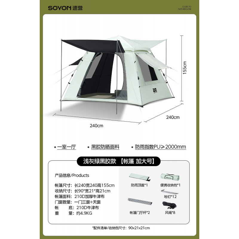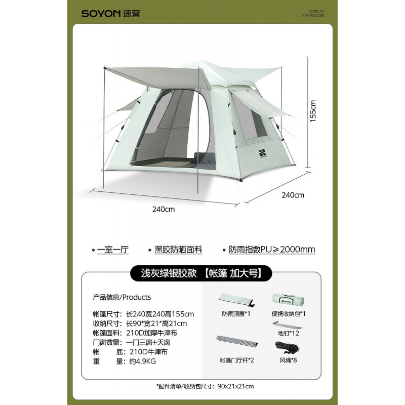 Серо-зеленый-[Упаковка влагонепроницаемого коврика] Палатка с серебряным клеем + навес [Большой размер]