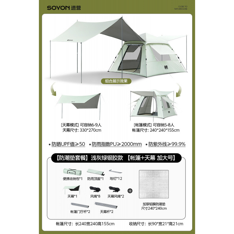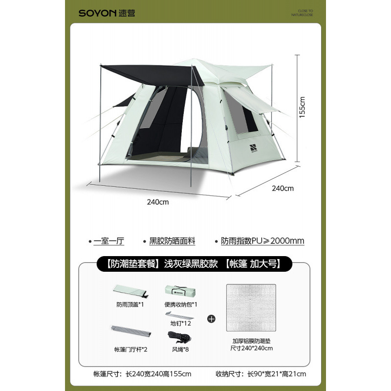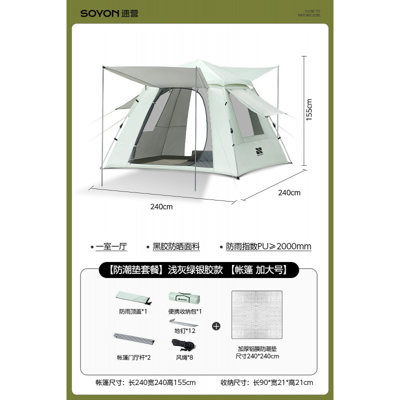 Серо-зеленый-[Влагостойкий коврик] Палатка с серебряным клеем [Большой размер, 5-8 человек]