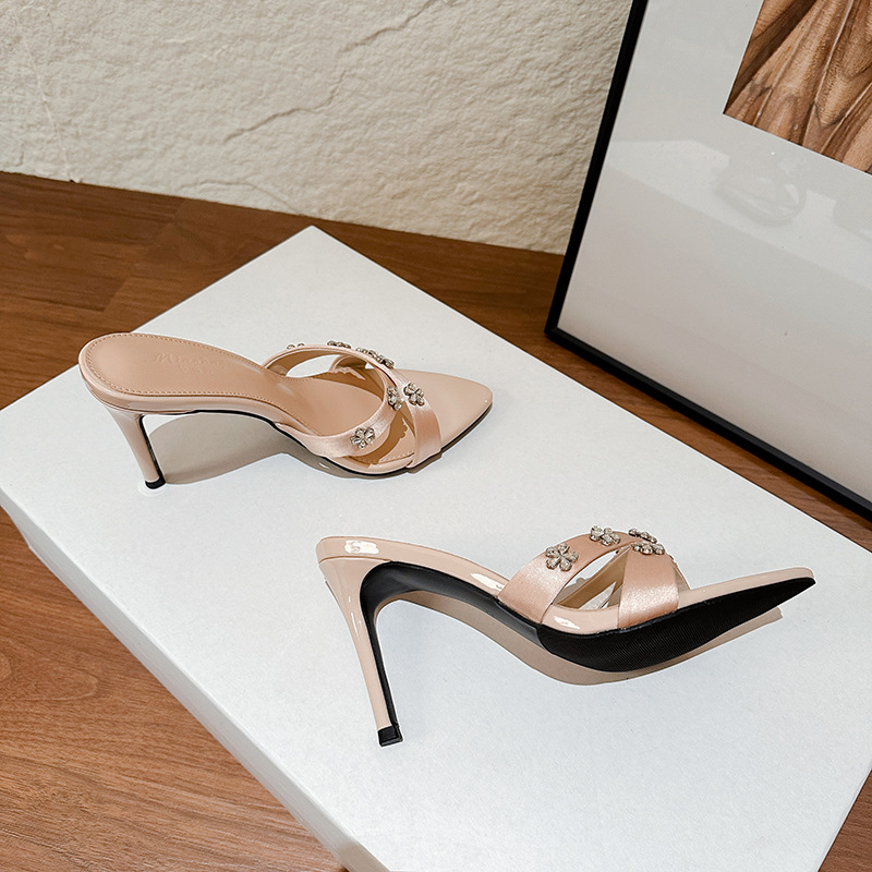 Главная страница > 2025 новые летние стильные однотонные сандалии телесного цвета со стразами, острым носком, открытым носком, шпильками, красивые женские босоножки на высоком каблуке