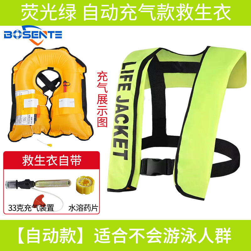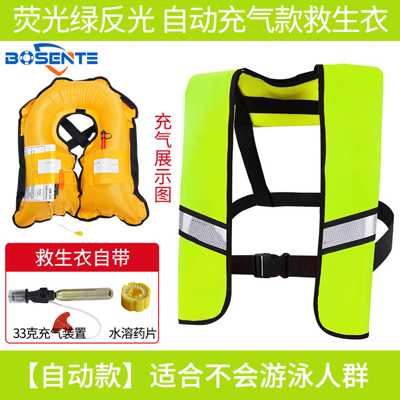 Светоотражающий автоматический спасательный жилет флуоресцентного зеленого цвета.