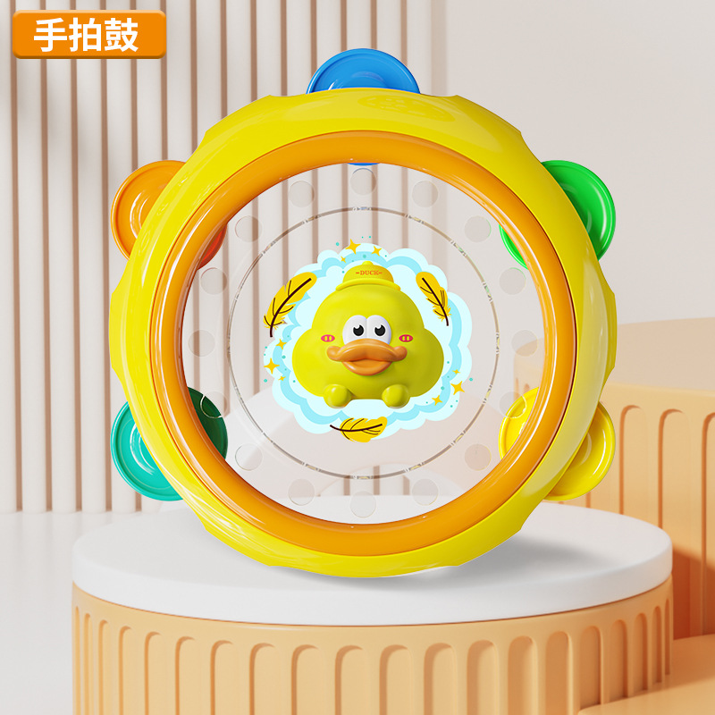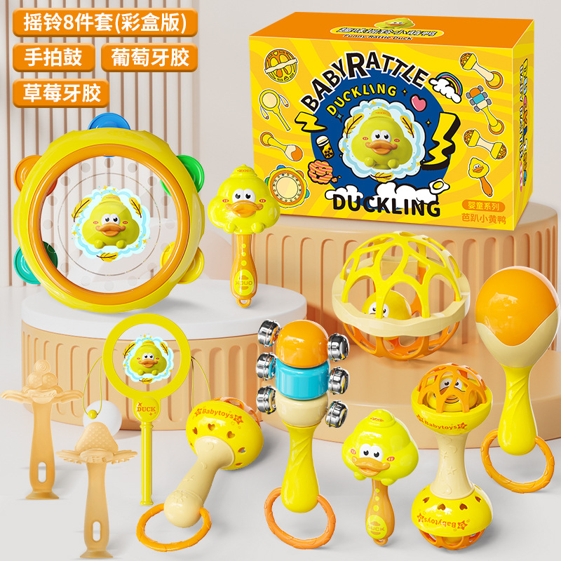 [Цветная коробка] Погремушка Bapa Little Yellow Duck, набор погремушек из 8 предметов + ручной барабан + португальская резинка + прорезыватель для клубники