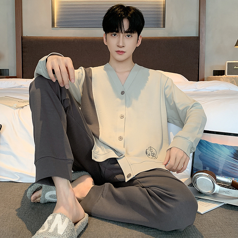 Пижама мужская весна и осень хлопок длинные рукава брюки новые мальчики V-образный кардиган простой повседневный набор домашней одежды