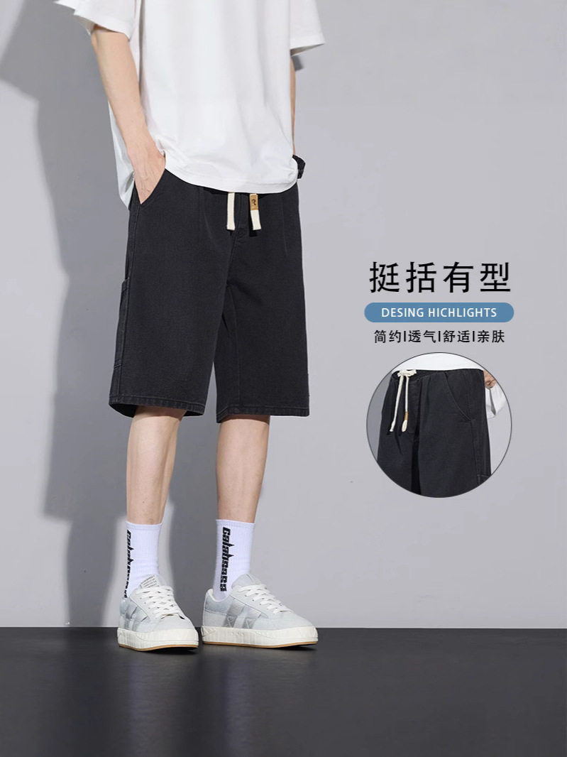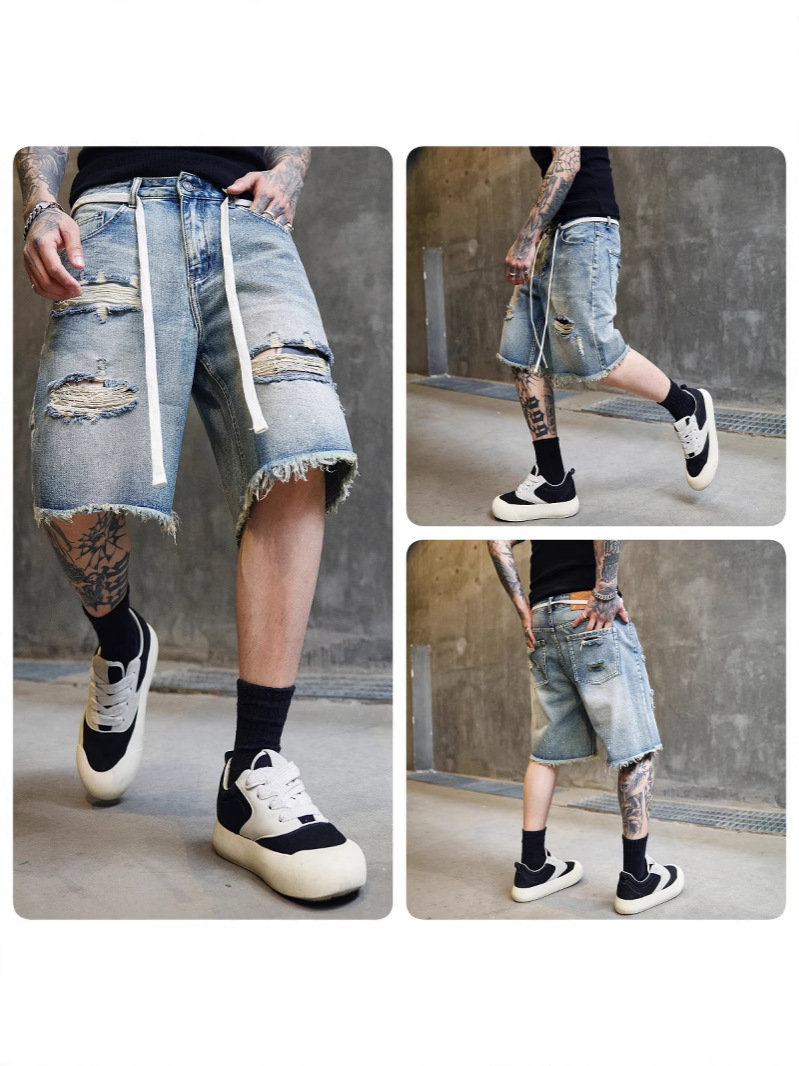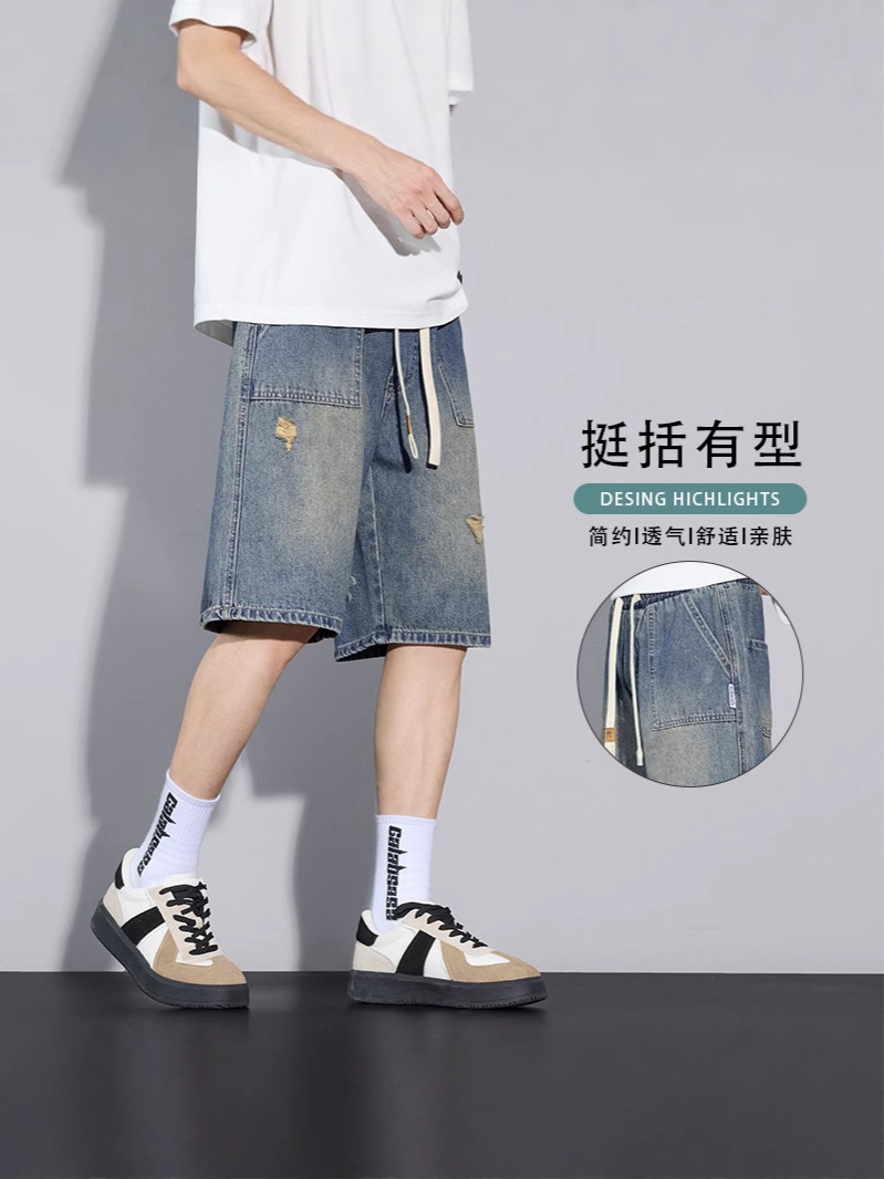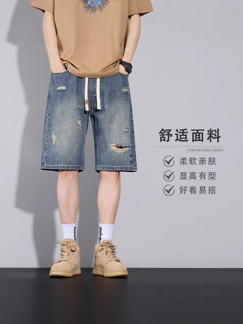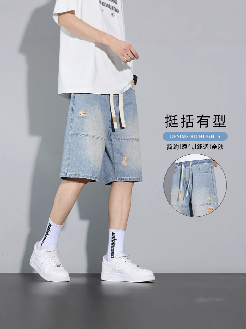 Главная страница > Мужские синие джинсовые шорты 2025 лето корейская версия рваные свободные узкие ретро эластичный пояс повседневные шорты средней длины