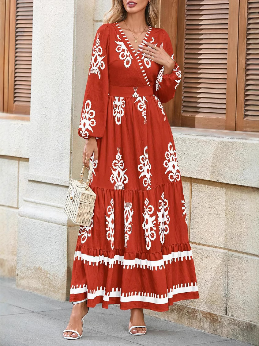 Европейское и американское кросс-бордерное платье 2025 года, богемное цветочное платье с длинными рукавами и V-образным вырезом, элегантное пляжное длинное платье для женщин