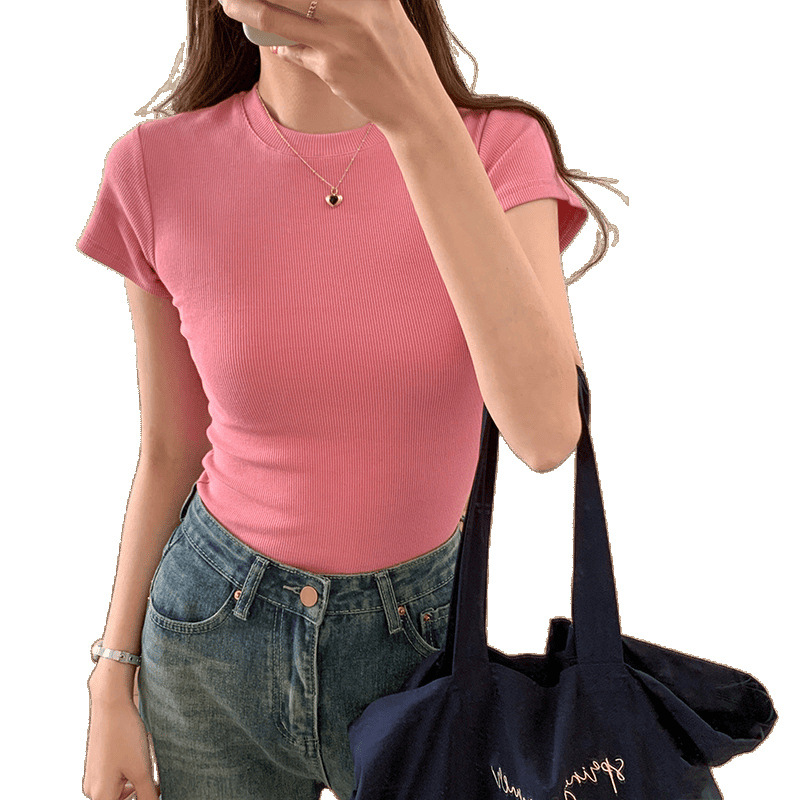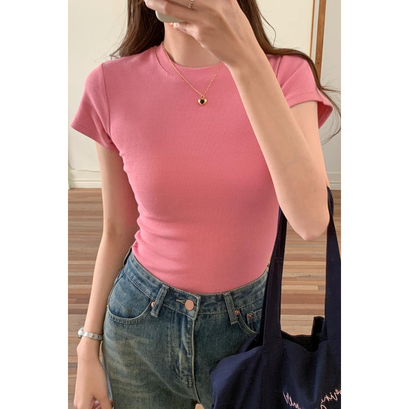 Главная страница > Настоящая футболка в американском стиле с ребристым правым плечом для женщин, новая летняя футболка с короткими рукавами, облегающий многослойный короткий базовый слой с круглым вырезом