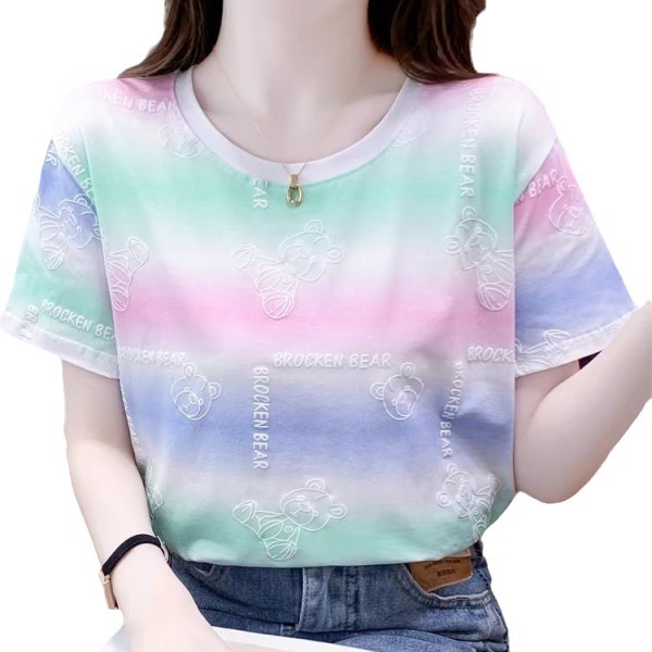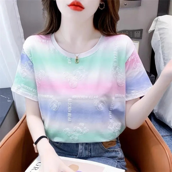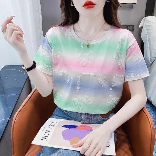 Главная страница > Женская футболка в радужную полоску с короткими рукавами, новинка лета 2024, универсальный повседневный свободный топ с круглым вырезом в корейском стиле