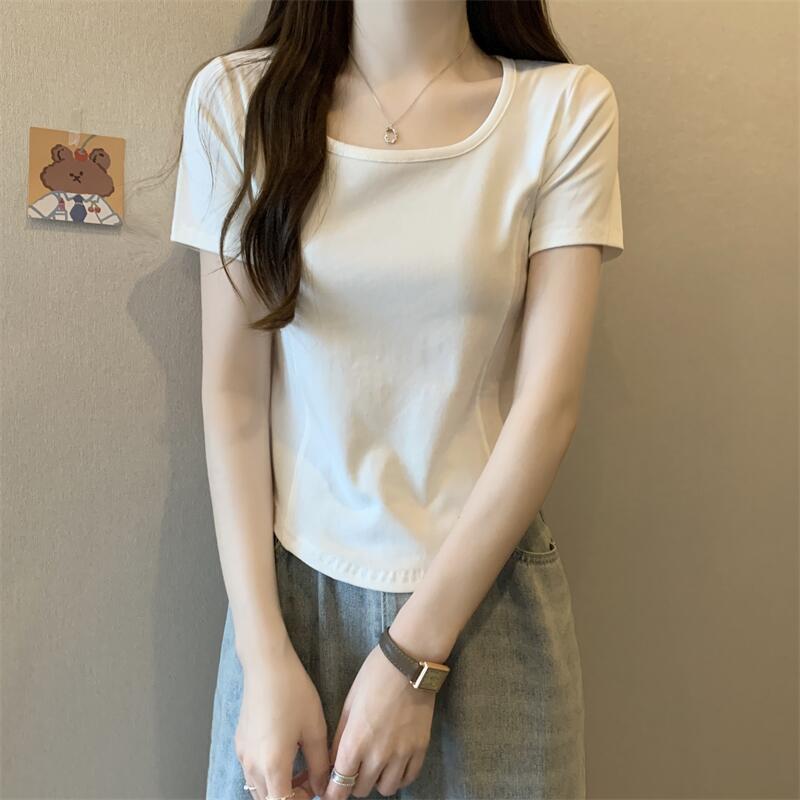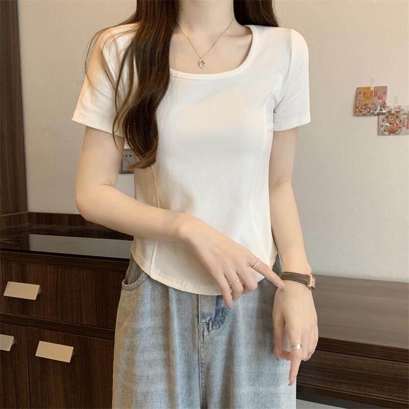 Женская футболка с квадратным вырезом и правым плечом, новинка 2023 года, летняя утягивающая асимметричная нишевая короткая белая хлопковая футболка с короткими рукавами