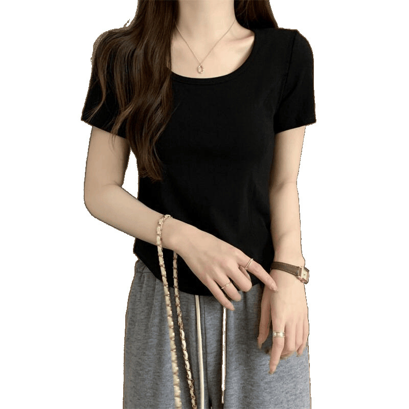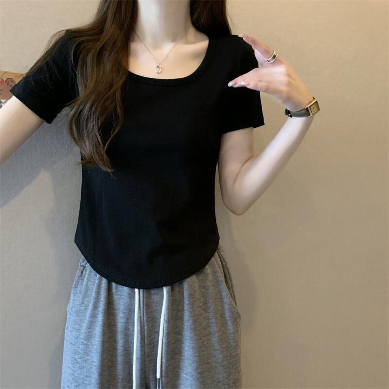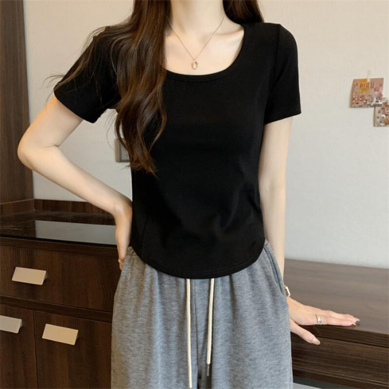 Главная страница > Женская футболка с квадратным вырезом и правым плечом, новинка 2023 года, летняя утягивающая асимметричная нишевая короткая белая хлопковая футболка с короткими рукавами