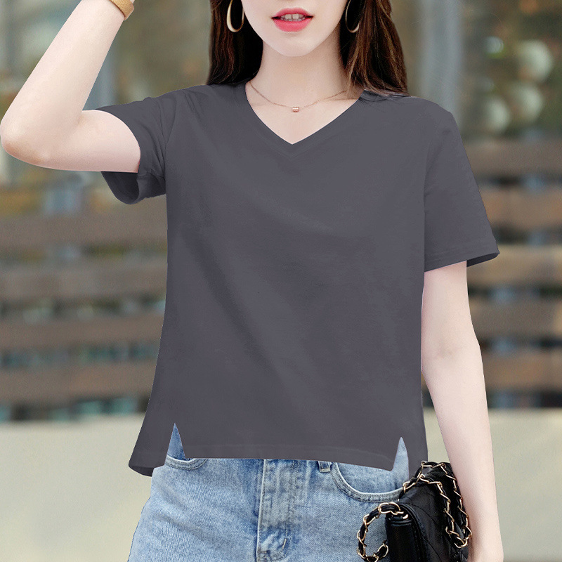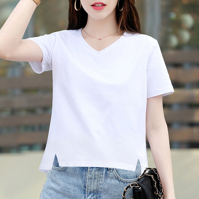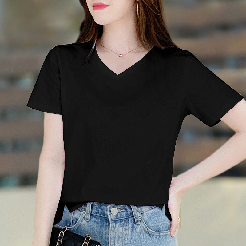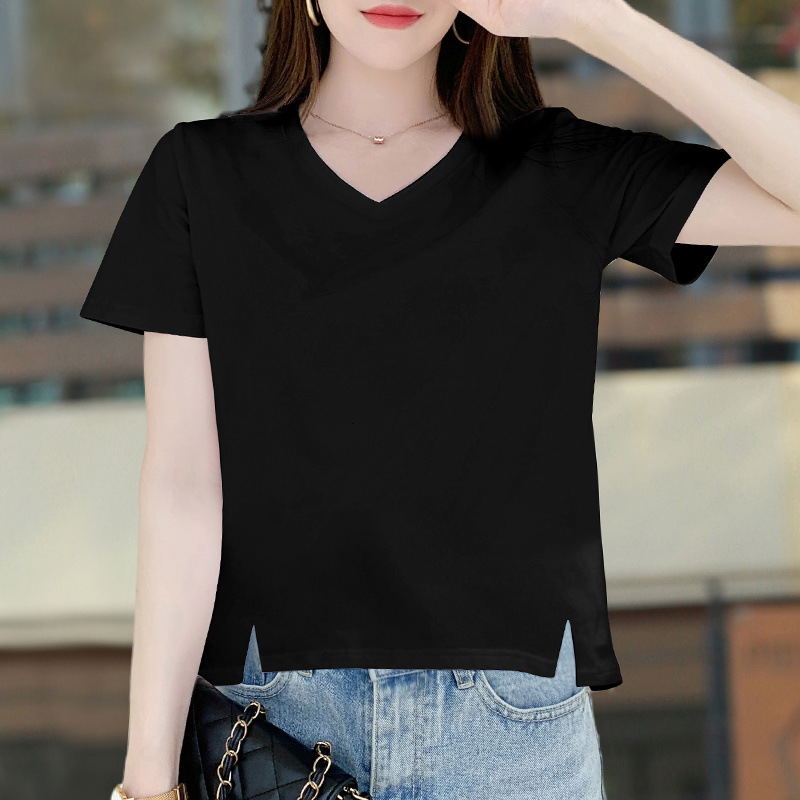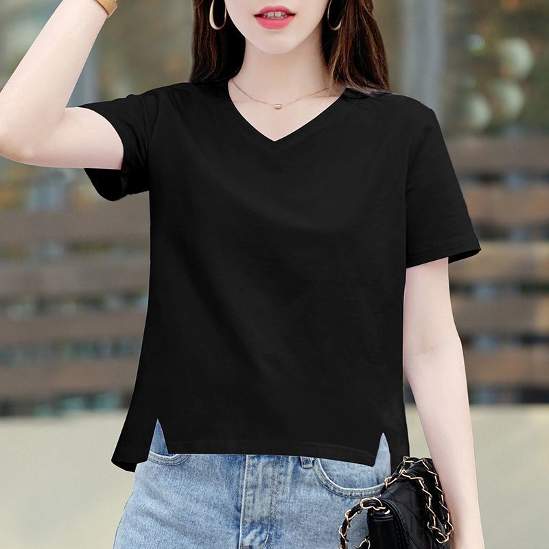 Главная страница > Черная свободная футболка с v-образным вырезом, женская летняя футболка с короткими рукавами из чистого хлопка на правое плечо, модный топ с разрезом в корейском стиле