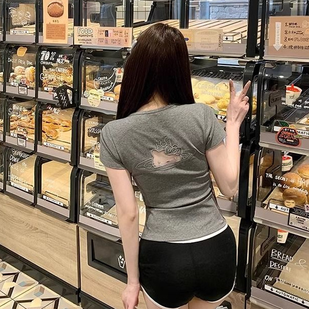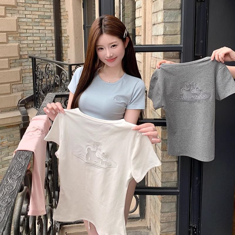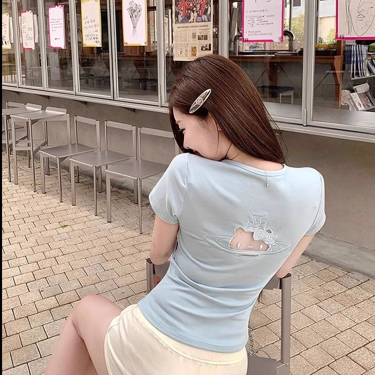 Главная страница > 纯色正肩圆领T恤女短袖夏季薄款修身显瘦镂空洋气收腰辣妹t恤上衣